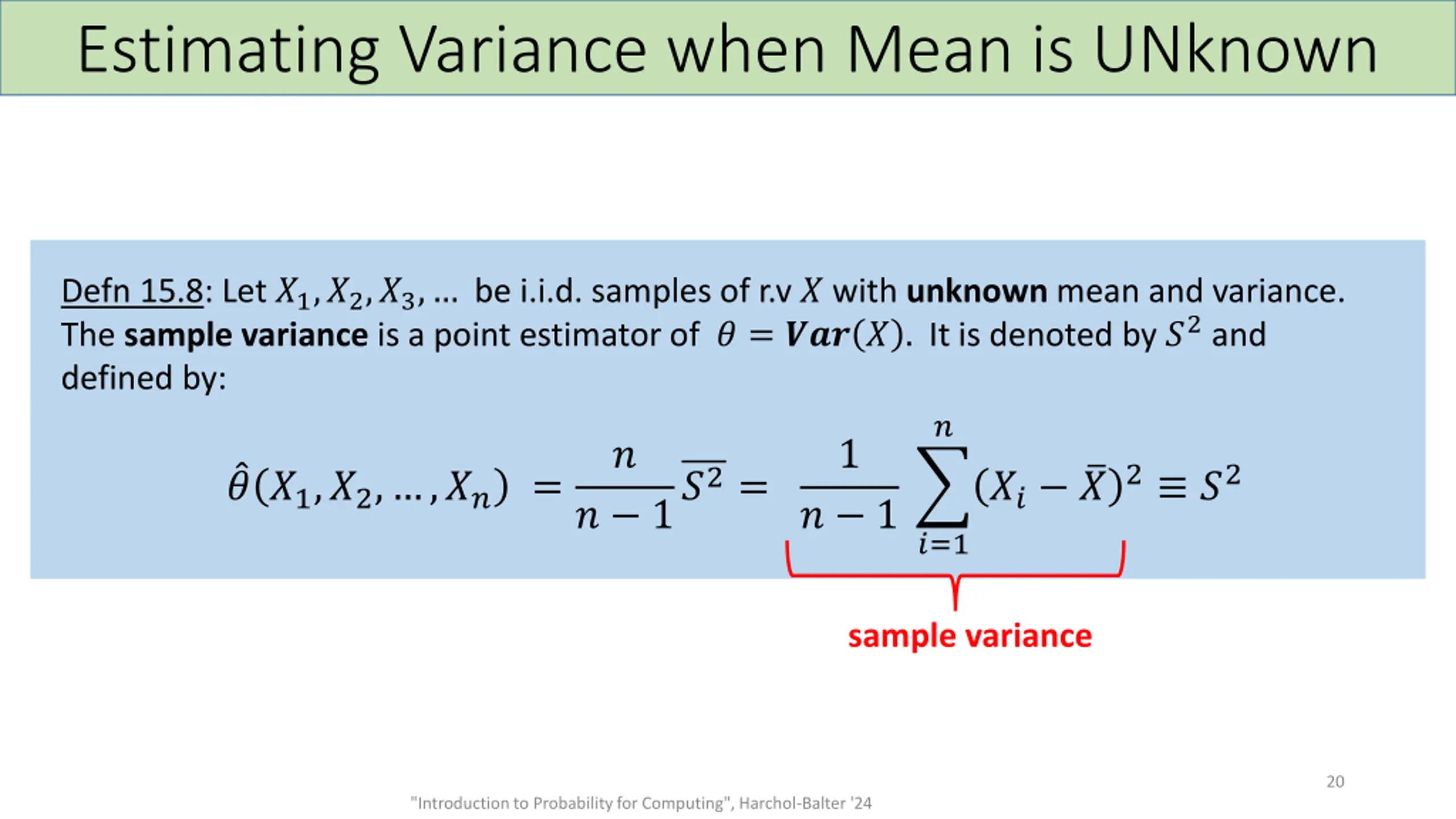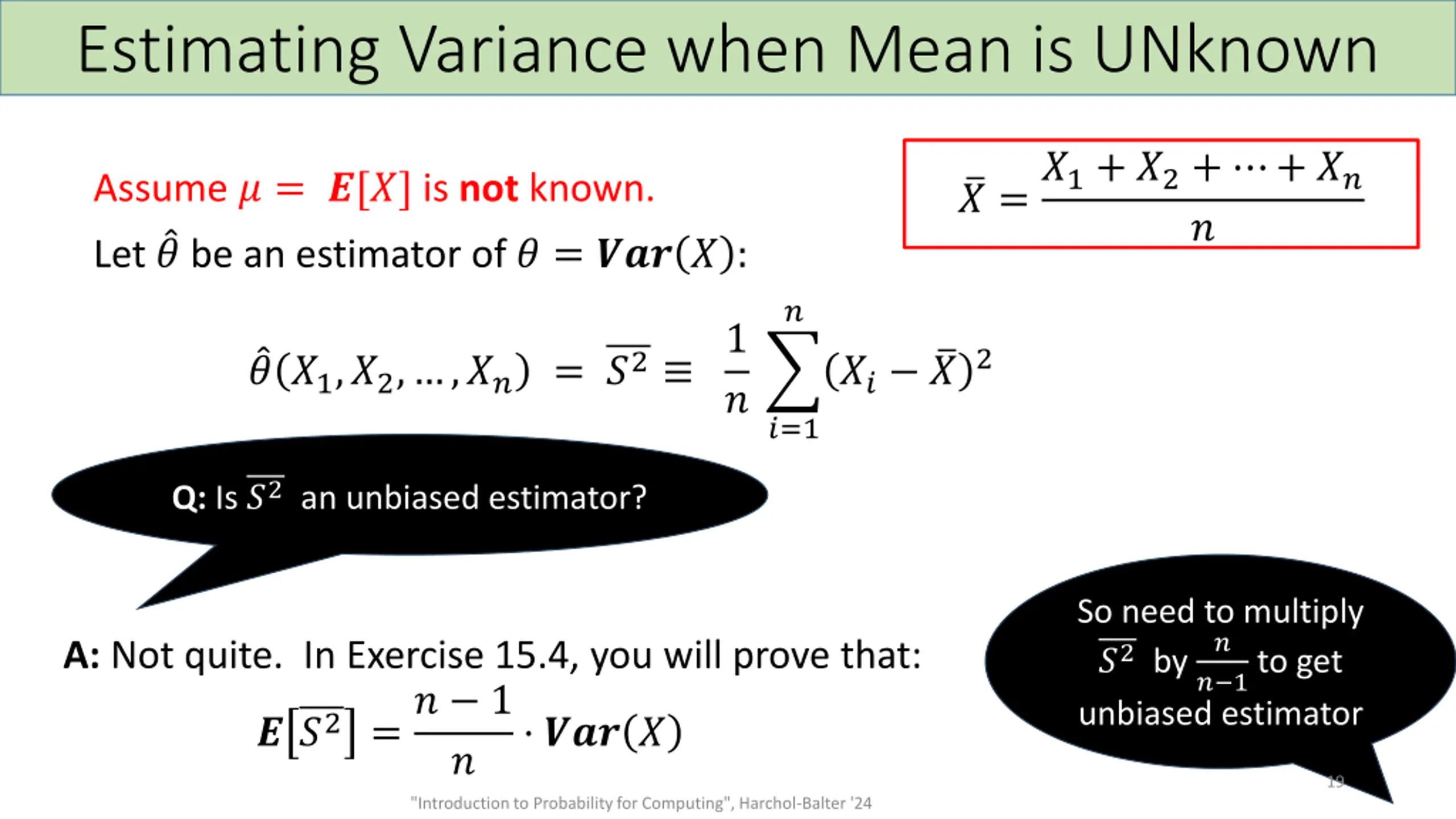 Estimating Variance when Mean is UNknown ? =?1+ ?2+ + ?? Assume ? = ?[?] is not known. Let ? be an estimator of ? = ??? ? : ? ? ? ?1,?2, ,?? = ?2 1 ?? ?2 ? ?=1 Q: Is ?2an unbiased estimator? So need to multiply ?2by ? 1 to get unbiased estimator ? A: Not quite. In Exercise 15.4, you will prove that: ? ?2=? 1 ? ??? ? 19 "Introduction to Probability for Computing", Harchol-Balter '24