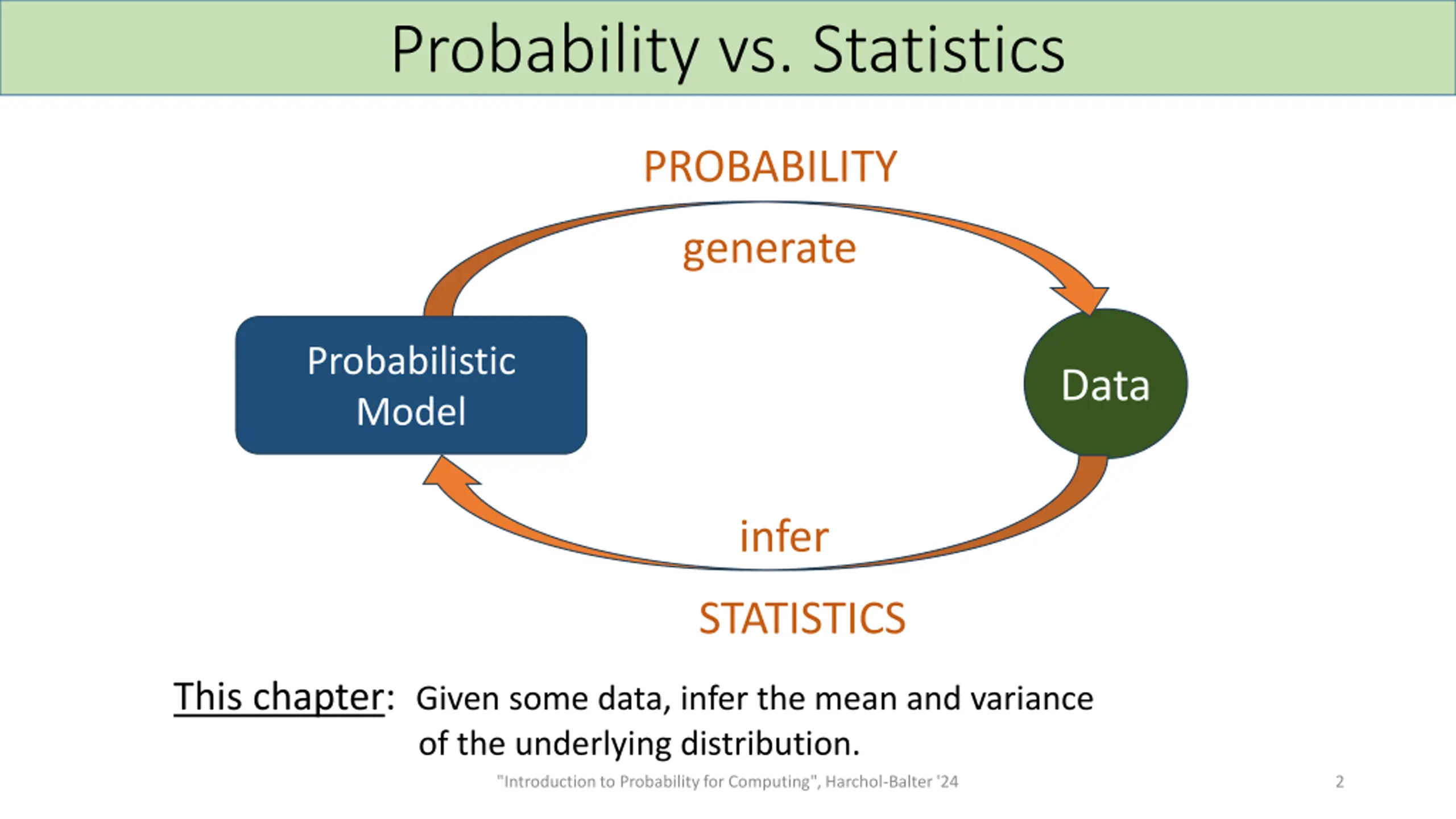 Probability vs. Statistics PROBABILITY generate Probabilistic Model Data infer STATISTICS This chapter: Given some data, infer the mean and variance of the underlying distribution. "Introduction to Probability for Computing", Harchol-Balter '24 2