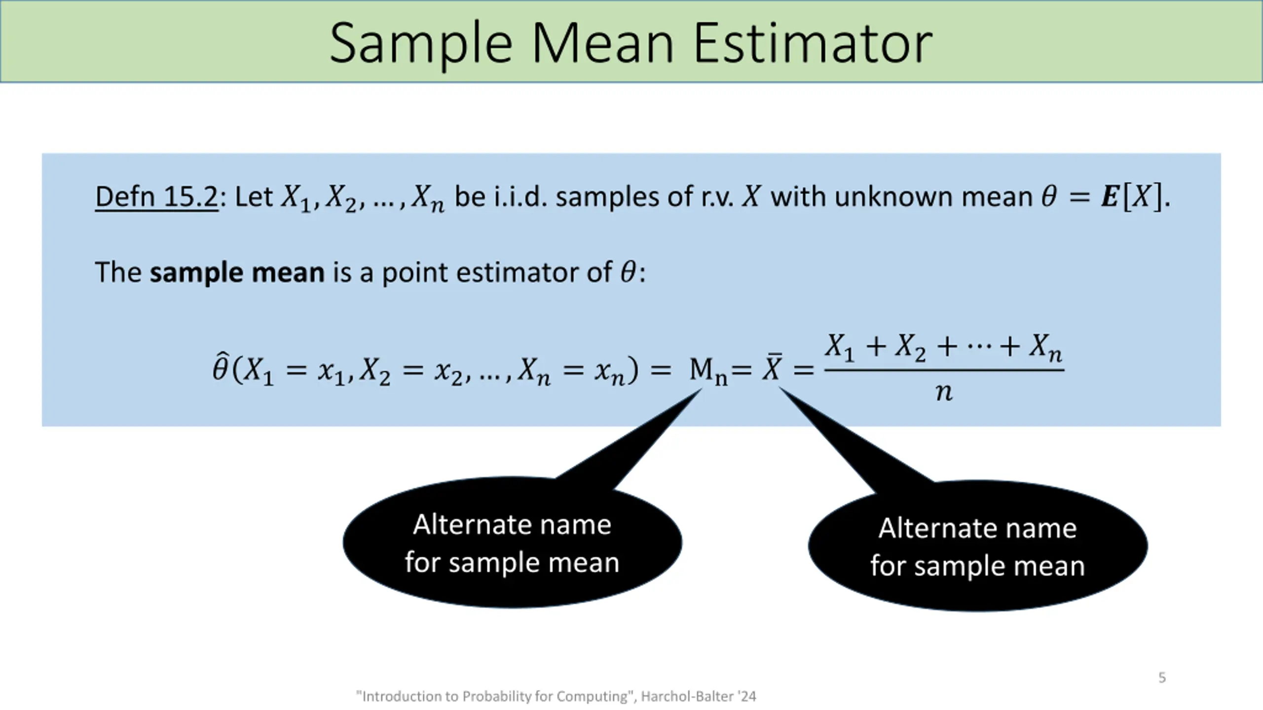 Sample Mean Estimator Defn 15.2: Let ?1,?2, ,?? be i.i.d. samples of r.v. ? with unknown mean ? = ? ? . The sample mean is a point estimator of ?: ? ?1= ?1,?2= ?2, ,??= ?? = Mn= ? =?1+ ?2+ + ?? ? Alternate name for sample mean Alternate name for sample mean 5 "Introduction to Probability for Computing", Harchol-Balter '24