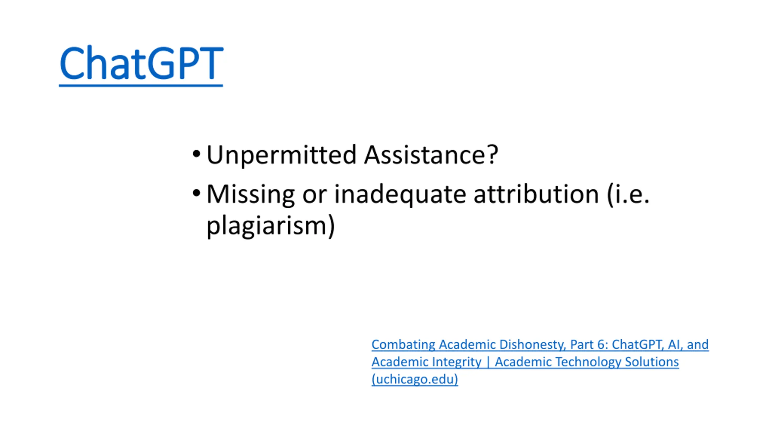 ChatGPT ChatGPT Unpermitted Assistance? Missing or inadequate attribution (i.e. plagiarism) Combating Academic Dishonesty, Part 6: ChatGPT, AI, and Academic Integrity | Academic Technology Solutions (uchicago.edu)