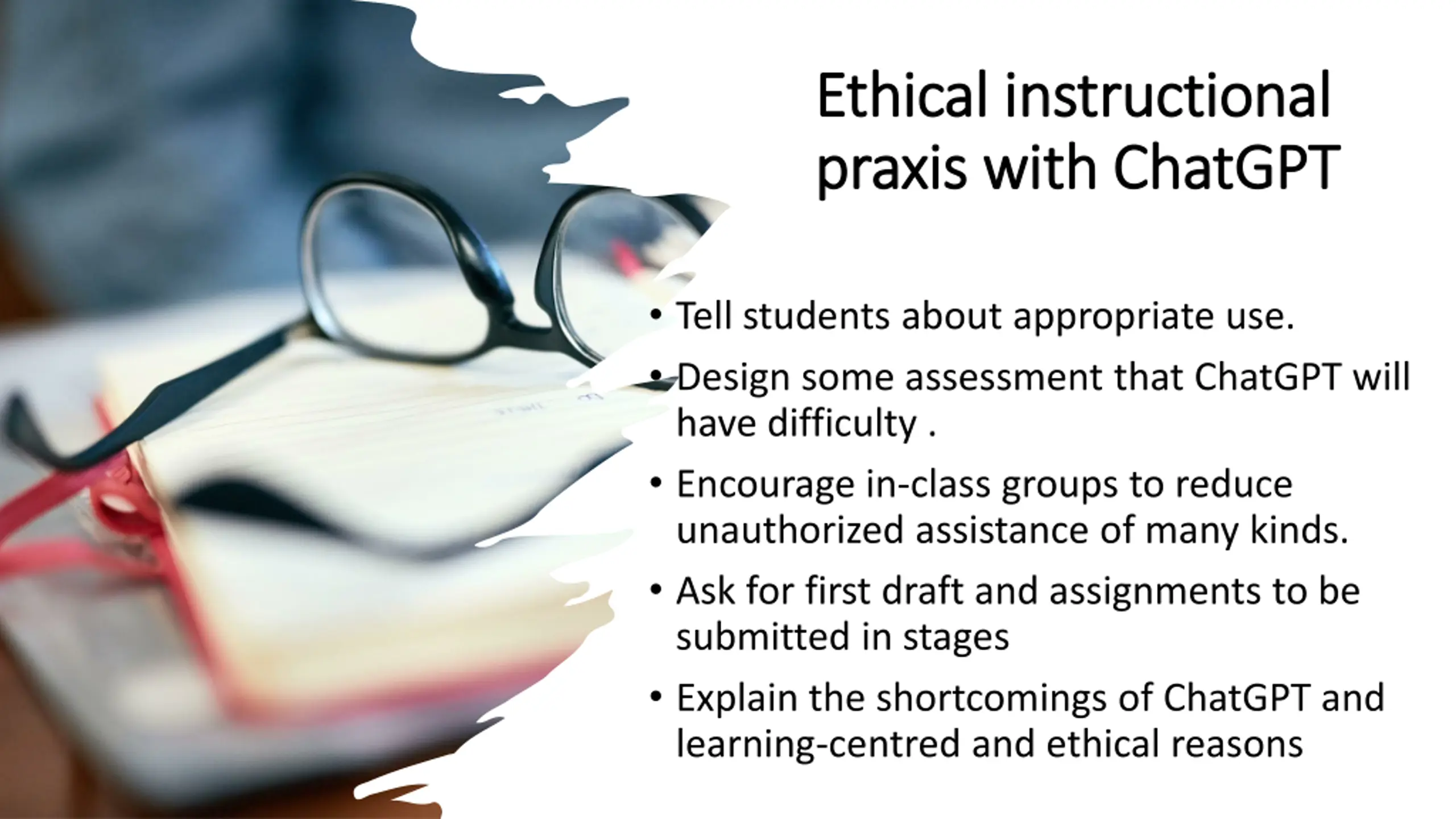 Ethical instructional Ethical instructional praxis with praxis with ChatGPT ChatGPT Tell students about appropriate use. Design some assessment that ChatGPT will have difficulty . Encourage in-class groups to reduce unauthorized assistance of many kinds. Ask for first draft and assignments to be submitted in stages Explain the shortcomings of ChatGPT and learning-centred and ethical reasons