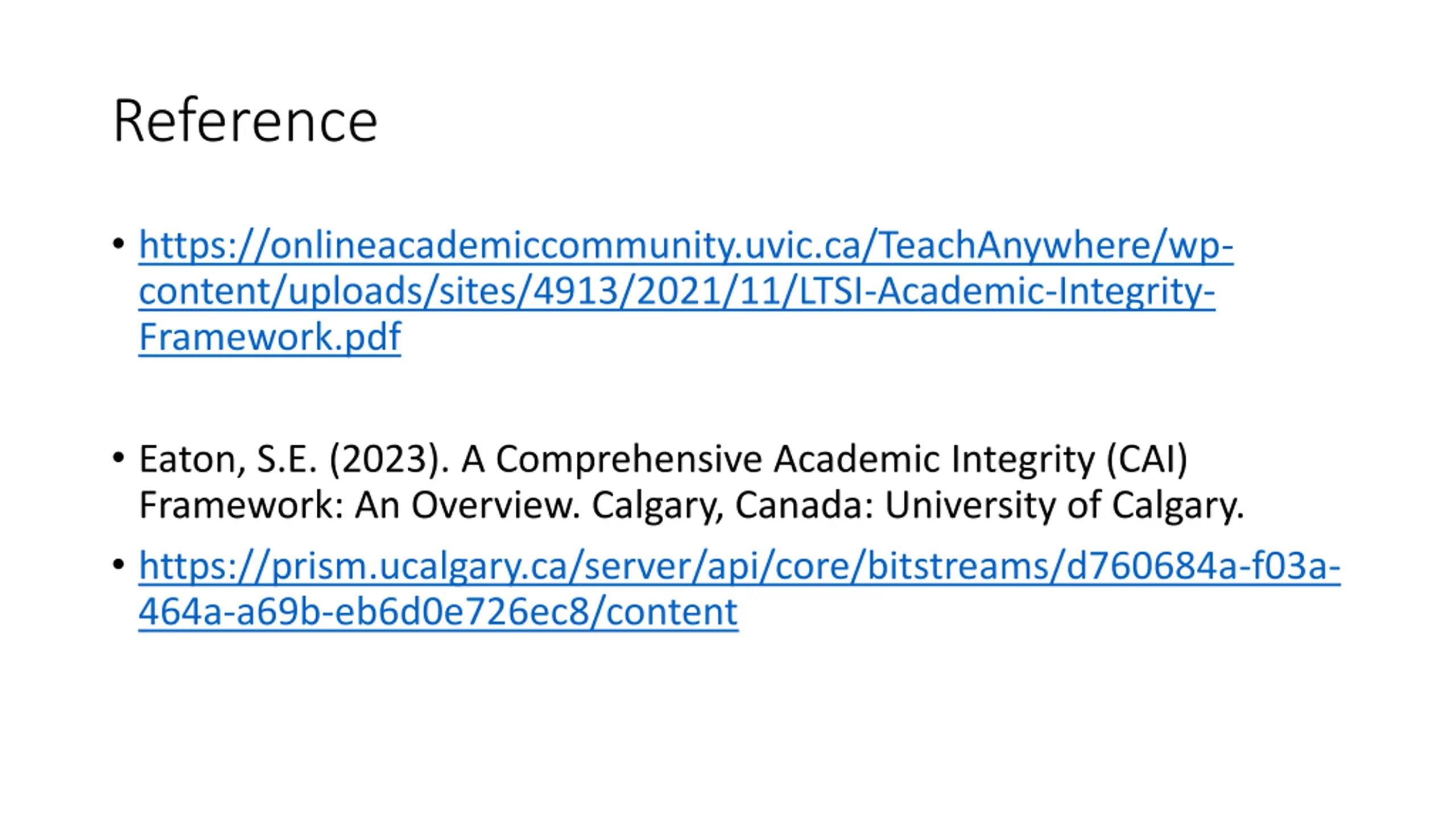 Reference https://onlineacademiccommunity.uvic.ca/TeachAnywhere/wp- content/uploads/sites/4913/2021/11/LTSI-Academic-Integrity- Framework.pdf Eaton, S.E. (2023). A Comprehensive Academic Integrity (CAI) Framework: An Overview. Calgary, Canada: University of Calgary. https://prism.ucalgary.ca/server/api/core/bitstreams/d760684a-f03a- 464a-a69b-eb6d0e726ec8/content