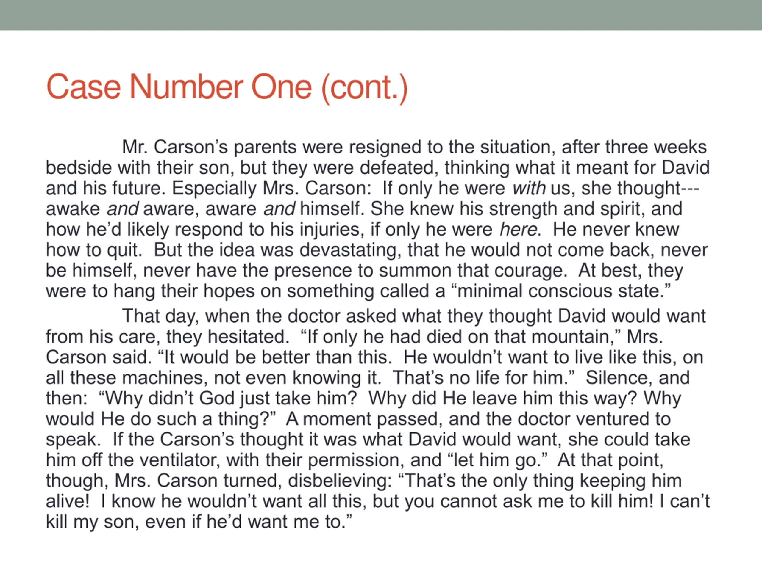 Case Number One (cont.) Mr. Carson s parents were resigned to the situation, after three weeks bedside with their son, but they were defeated, thinking what it meant for David and his future. Especially Mrs. Carson: If only he were with us, she thought--- awake and aware, aware and himself. She knew his strength and spirit, and how he d likely respond to his injuries, if only he were here. He never knew how to quit. But the idea was devastating, that he would not come back, never be himself, never have the presence to summon that courage. At best, they were to hang their hopes on something called a minimal conscious state. That day, when the doctor asked what they thought David would want from his care, they hesitated. If only he had died on that mountain, Mrs. Carson said. It would be better than this. He wouldn t want to live like this, on all these machines, not even knowing it. That s no life for him. Silence, and then: Why didn t God just take him? Why did He leave him this way? Why would He do such a thing? A moment passed, and the doctor ventured to speak. If the Carson s thought it was what David would want, she could take him off the ventilator, with their permission, and let him go. At that point, though, Mrs. Carson turned, disbelieving: That s the only thing keeping him alive! I know he wouldn t want all this, but you cannot ask me to kill him! I can t kill my son, even if he d want me to.