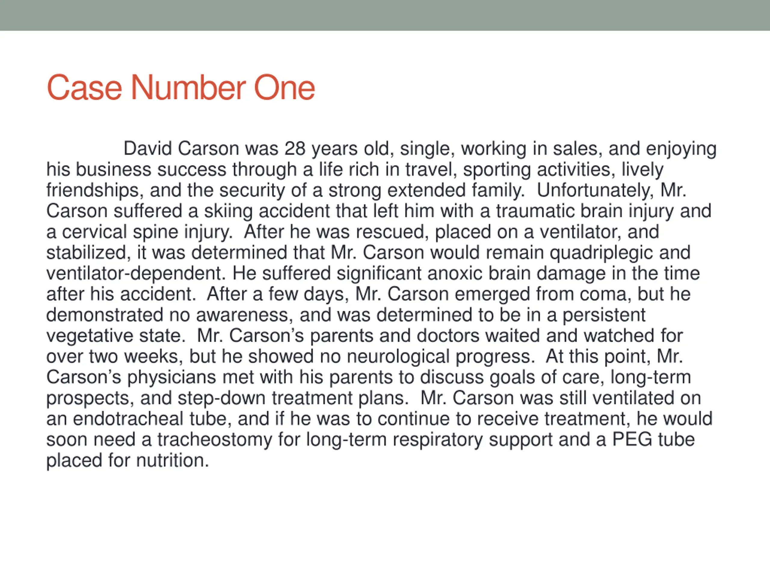 Case Number One David Carson was 28 years old, single, working in sales, and enjoying his business success through a life rich in travel, sporting activities, lively friendships, and the security of a strong extended family. Unfortunately, Mr. Carson suffered a skiing accident that left him with a traumatic brain injury and a cervical spine injury. After he was rescued, placed on a ventilator, and stabilized, it was determined that Mr. Carson would remain quadriplegic and ventilator-dependent. He suffered significant anoxic brain damage in the time after his accident. After a few days, Mr. Carson emerged from coma, but he demonstrated no awareness, and was determined to be in a persistent vegetative state. Mr. Carson s parents and doctors waited and watched for over two weeks, but he showed no neurological progress. At this point, Mr. Carson s physicians met with his parents to discuss goals of care, long-term prospects, and step-down treatment plans. Mr. Carson was still ventilated on an endotracheal tube, and if he was to continue to receive treatment, he would soon need a tracheostomy for long-term respiratory support and a PEG tube placed for nutrition.