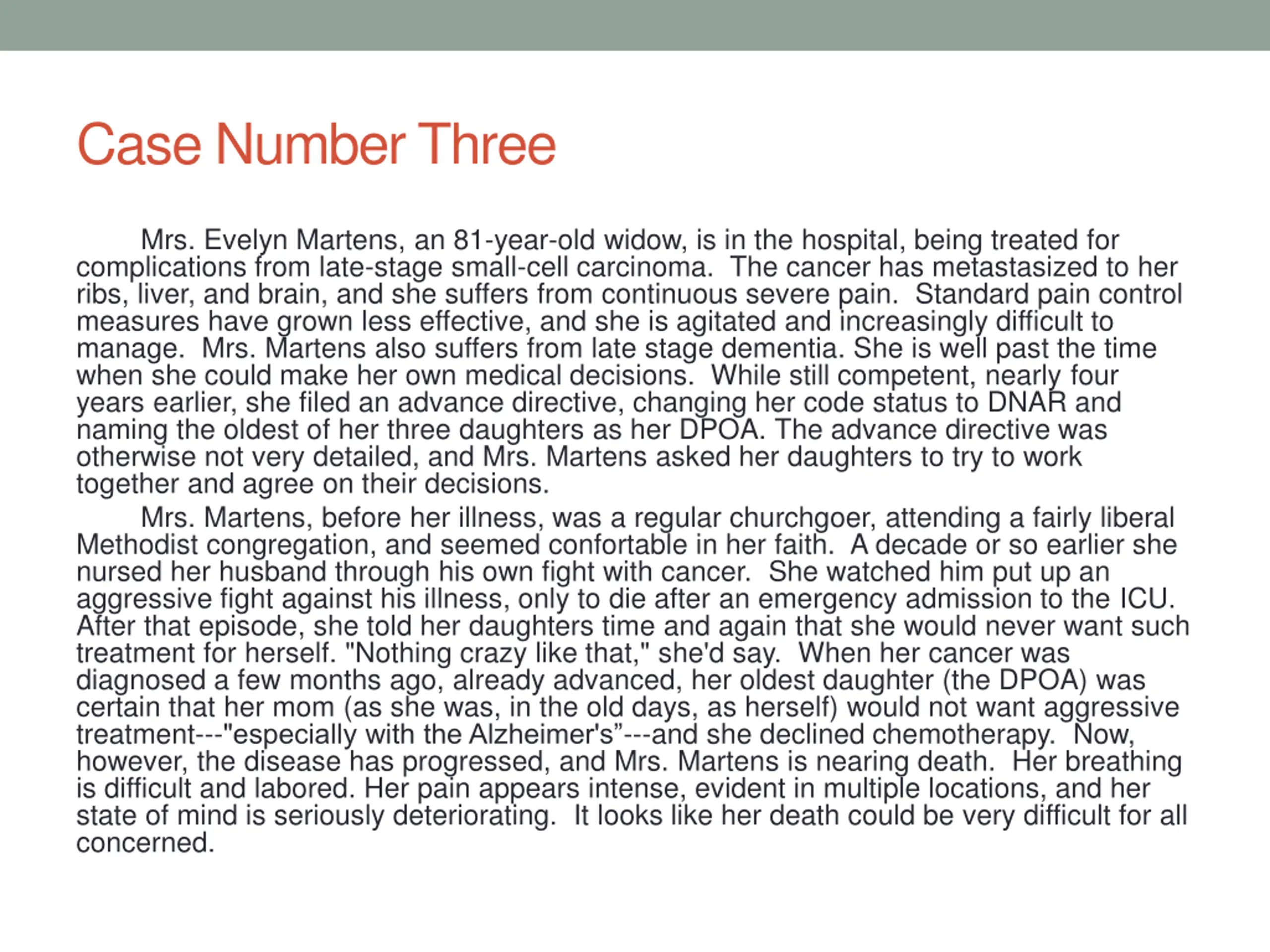 Case Number Three Mrs. Evelyn Martens, an 81-year-old widow, is in the hospital, being treated for complications from late-stage small-cell carcinoma. The cancer has metastasized to her ribs, liver, and brain, and she suffers from continuous severe pain. Standard pain control measures have grown less effective, and she is agitated and increasingly difficult to manage. Mrs. Martens also suffers from late stage dementia. She is well past the time when she could make her own medical decisions. While still competent, nearly four years earlier, she filed an advance directive, changing her code status to DNAR and naming the oldest of her three daughters as her DPOA. The advance directive was otherwise not very detailed, and Mrs. Martens asked her daughters to try to work together and agree on their decisions. Mrs. Martens, before her illness, was a regular churchgoer, attending a fairly liberal Methodist congregation, and seemed confortable in her faith. A decade or so earlier she nursed her husband through his own fight with cancer. She watched him put up an aggressive fight against his illness, only to die after an emergency admission to the ICU. After that episode, she told her daughters time and again that she would never want such treatment for herself. "Nothing crazy like that," she'd say. When her cancer was diagnosed a few months ago, already advanced, her oldest daughter (the DPOA) was certain that her mom (as she was, in the old days, as herself) would not want aggressive treatment---"especially with the Alzheimer's ---and she declined chemotherapy. Now, however, the disease has progressed, and Mrs. Martens is nearing death. Her breathing is difficult and labored. Her pain appears intense, evident in multiple locations, and her state of mind is seriously deteriorating. It looks like her death could be very difficult for all concerned.