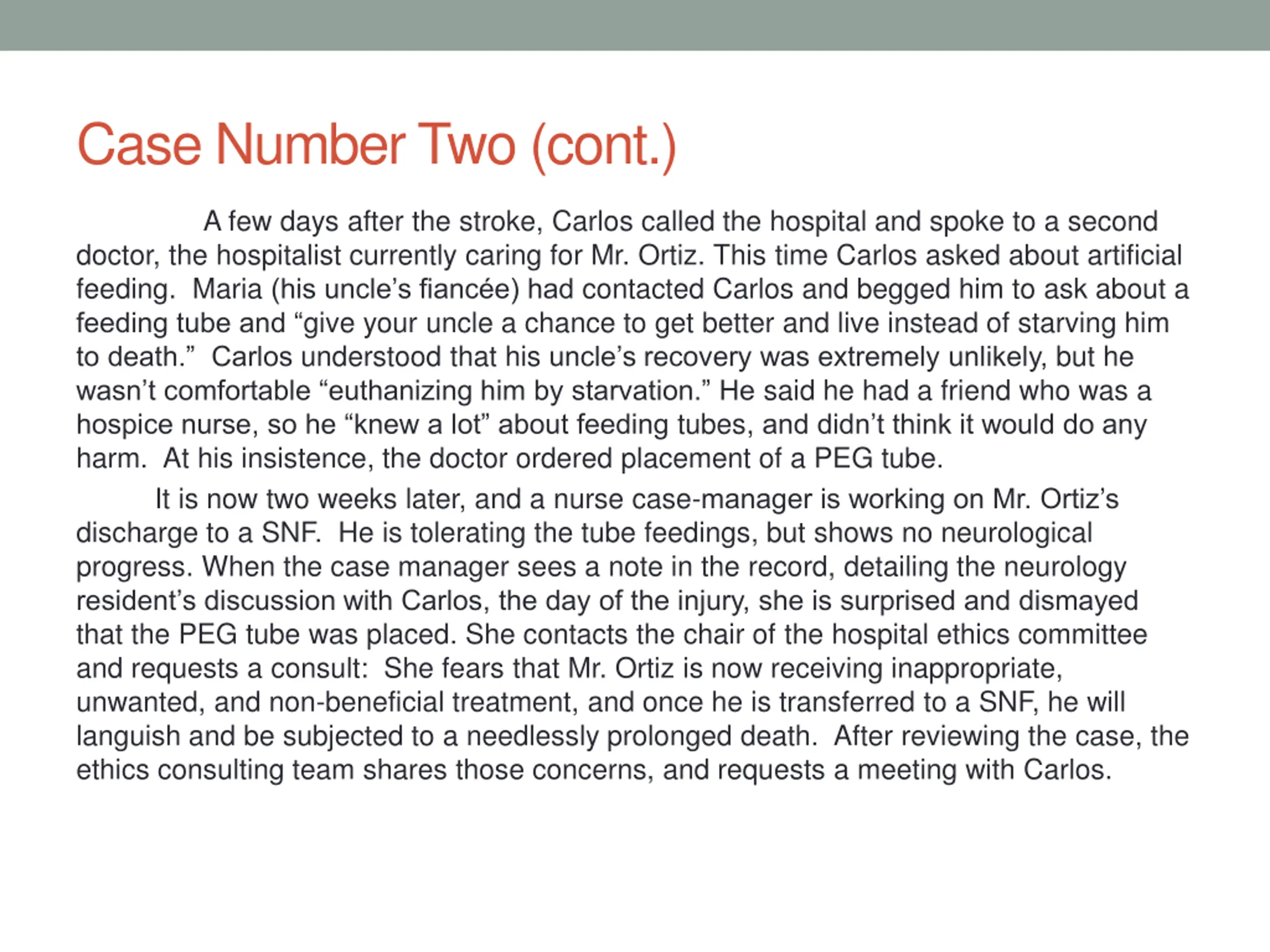 Case Number Two (cont.) A few days after the stroke, Carlos called the hospital and spoke to a second doctor, the hospitalist currently caring for Mr. Ortiz. This time Carlos asked about artificial feeding. Maria (his uncle s fianc e) had contacted Carlos and begged him to ask about a feeding tube and give your uncle a chance to get better and live instead of starving him to death. Carlos understood that his uncle s recovery was extremely unlikely, but he wasn t comfortable euthanizing him by starvation. He said he had a friend who was a hospice nurse, so he knew a lot about feeding tubes, and didn t think it would do any harm. At his insistence, the doctor ordered placement of a PEG tube. It is now two weeks later, and a nurse case-manager is working on Mr. Ortiz s discharge to a SNF. He is tolerating the tube feedings, but shows no neurological progress. When the case manager sees a note in the record, detailing the neurology resident s discussion with Carlos, the day of the injury, she is surprised and dismayed that the PEG tube was placed. She contacts the chair of the hospital ethics committee and requests a consult: She fears that Mr. Ortiz is now receiving inappropriate, unwanted, and non-beneficial treatment, and once he is transferred to a SNF, he will languish and be subjected to a needlessly prolonged death. After reviewing the case, the ethics consulting team shares those concerns, and requests a meeting with Carlos.