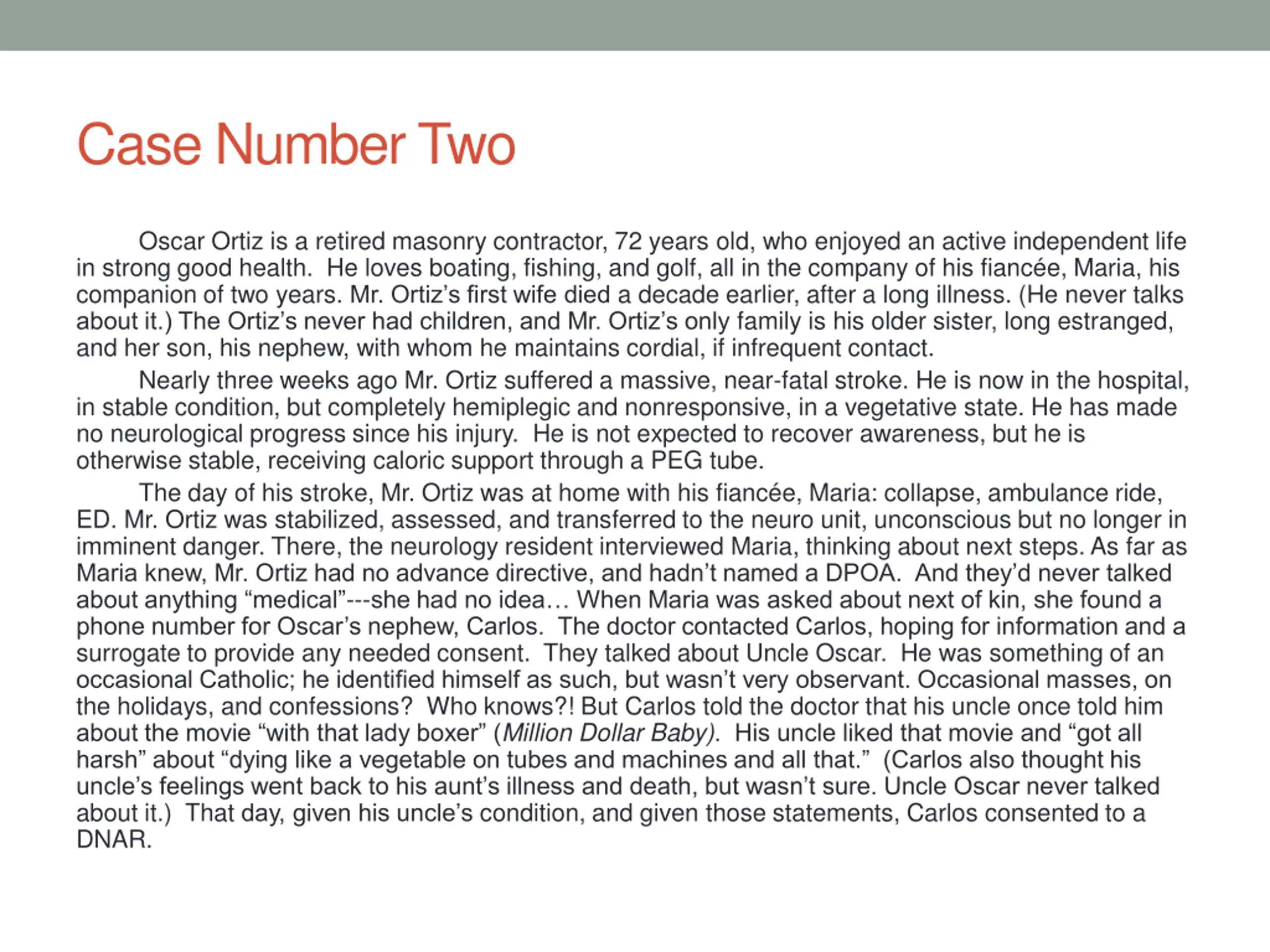 Case Number Two Oscar Ortiz is a retired masonry contractor, 72 years old, who enjoyed an active independent life in strong good health. He loves boating, fishing, and golf, all in the company of his fianc e, Maria, his companion of two years. Mr. Ortiz s first wife died a decade earlier, after a long illness. (He never talks about it.) The Ortiz s never had children, and Mr. Ortiz s only family is his older sister, long estranged, and her son, his nephew, with whom he maintains cordial, if infrequent contact. Nearly three weeks ago Mr. Ortiz suffered a massive, near-fatal stroke. He is now in the hospital, in stable condition, but completely hemiplegic and nonresponsive, in a vegetative state. He has made no neurological progress since his injury. He is not expected to recover awareness, but he is otherwise stable, receiving caloric support through a PEG tube. The day of his stroke, Mr. Ortiz was at home with his fianc e, Maria: collapse, ambulance ride, ED. Mr. Ortiz was stabilized, assessed, and transferred to the neuro unit, unconscious but no longer in imminent danger. There, the neurology resident interviewed Maria, thinking about next steps. As far as Maria knew, Mr. Ortiz had no advance directive, and hadn t named a DPOA. And they d never talked about anything medical ---she had no idea When Maria was asked about next of kin, she found a phone number for Oscar s nephew, Carlos. The doctor contacted Carlos, hoping for information and a surrogate to provide any needed consent. They talked about Uncle Oscar. He was something of an occasional Catholic; he identified himself as such, but wasn t very observant. Occasional masses, on the holidays, and confessions? Who knows?! But Carlos told the doctor that his uncle once told him about the movie with that lady boxer (Million Dollar Baby). His uncle liked that movie and got all harsh about dying like a vegetable on tubes and machines and all that. (Carlos also thought his uncle s feelings went back to his aunt s illness and death, but wasn t sure. Uncle Oscar never talked about it.) That day, given his uncle s condition, and given those statements, Carlos consented to a DNAR.
