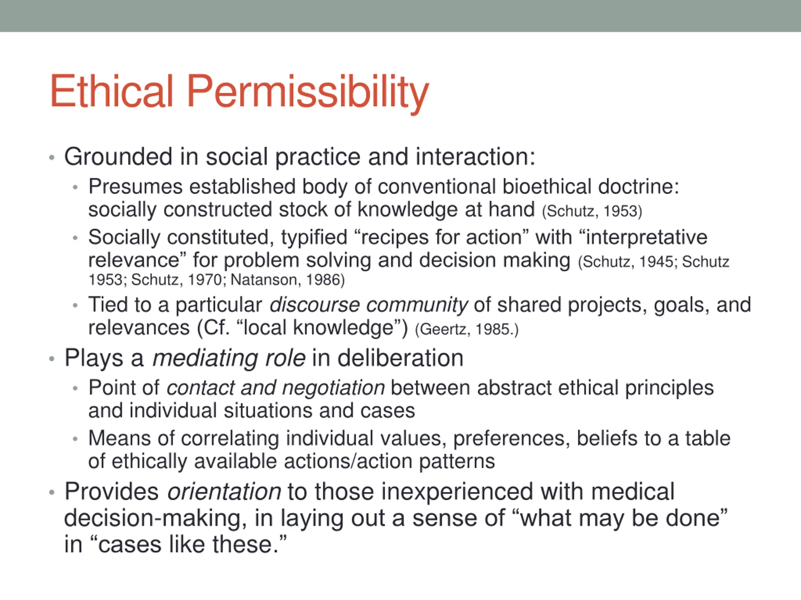 Ethical Permissibility Grounded in social practice and interaction: Presumes established body of conventional bioethical doctrine: socially constructed stock of knowledge at hand (Schutz, 1953) Socially constituted, typified recipes for action with interpretative relevance for problem solving and decision making (Schutz, 1945; Schutz 1953; Schutz, 1970; Natanson, 1986) Tied to a particular discourse community of shared projects, goals, and relevances (Cf. local knowledge ) (Geertz, 1985.) Plays a mediating role in deliberation Point of contact and negotiation between abstract ethical principles and individual situations and cases Means of correlating individual values, preferences, beliefs to a table of ethically available actions/action patterns Provides orientation to those inexperienced with medical decision-making, in laying out a sense of what may be done in cases like these.