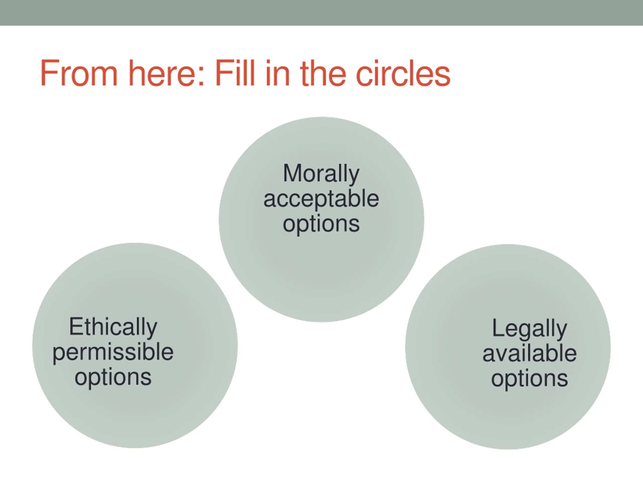 From here: Fill in the circles Morally acceptable options Ethically permissible options Legally available options