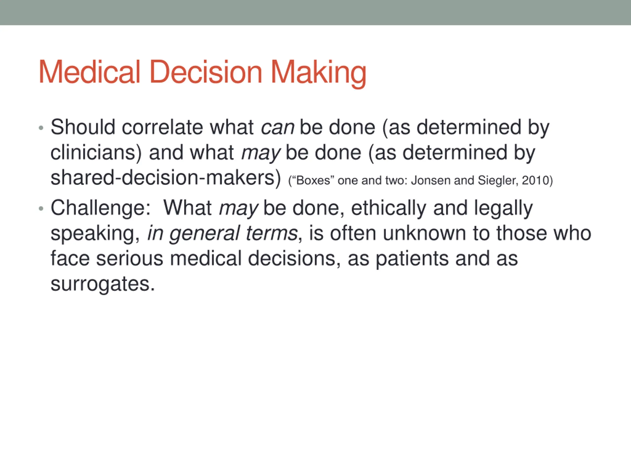 Medical Decision Making Should correlate what can be done (as determined by clinicians) and what may be done (as determined by shared-decision-makers) ( Boxes one and two: Jonsen and Siegler, 2010) Challenge: What may be done, ethically and legally speaking, in general terms, is often unknown to those who face serious medical decisions, as patients and as surrogates.