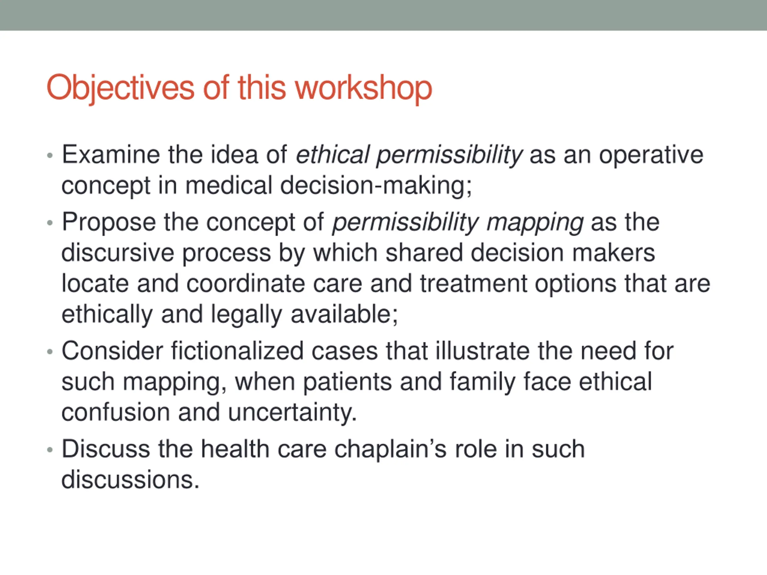 Objectives of this workshop Examine the idea of ethical permissibility as an operative concept in medical decision-making; Propose the concept of permissibility mapping as the discursive process by which shared decision makers locate and coordinate care and treatment options that are ethically and legally available; Consider fictionalized cases that illustrate the need for such mapping, when patients and family face ethical confusion and uncertainty. Discuss the health care chaplain s role in such discussions.
