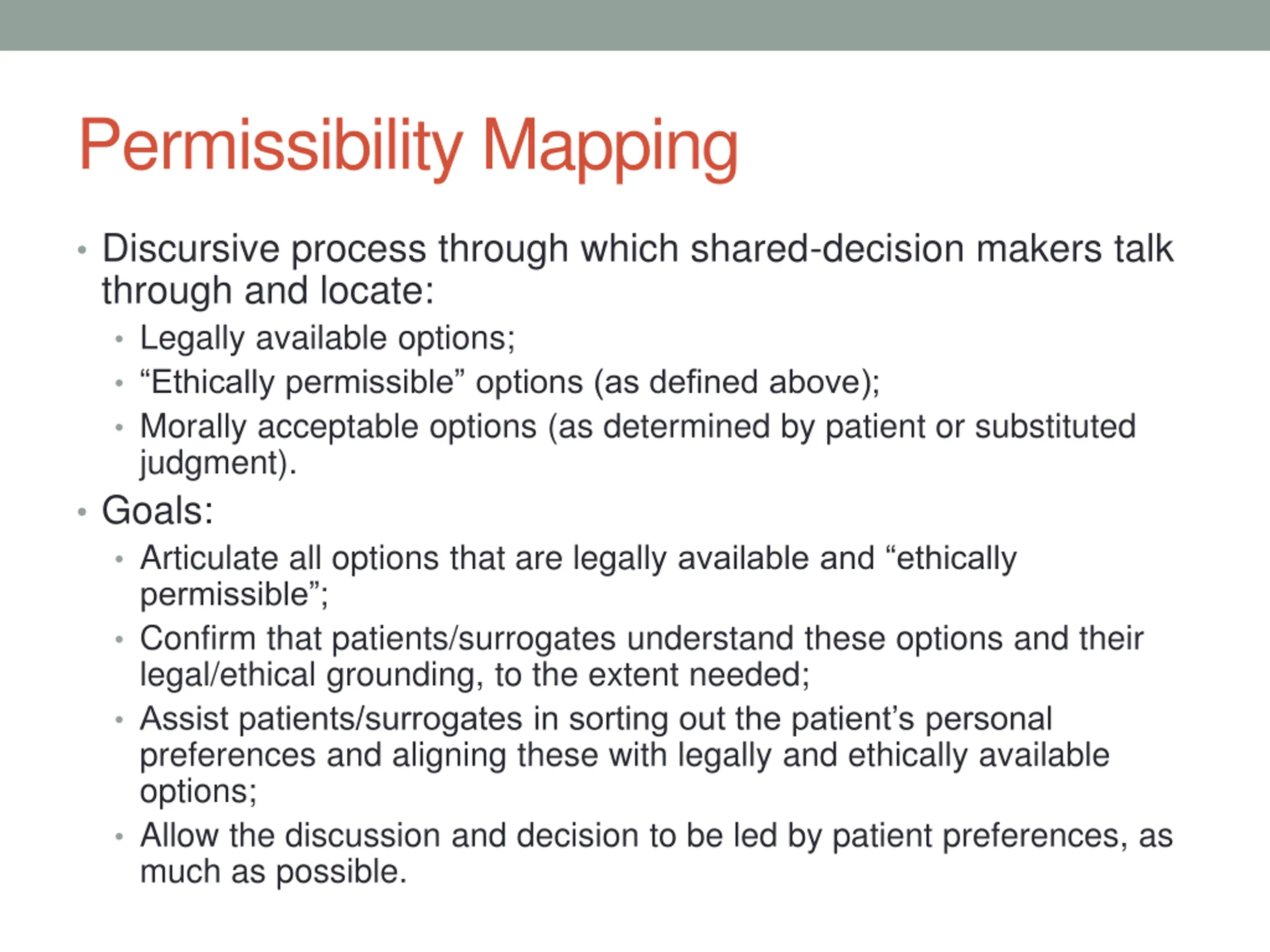 Permissibility Mapping Discursive process through which shared-decision makers talk through and locate: Legally available options; Ethically permissible options (as defined above); Morally acceptable options (as determined by patient or substituted judgment). Goals: Articulate all options that are legally available and ethically permissible ; Confirm that patients/surrogates understand these options and their legal/ethical grounding, to the extent needed; Assist patients/surrogates in sorting out the patient s personal preferences and aligning these with legally and ethically available options; Allow the discussion and decision to be led by patient preferences, as much as possible.