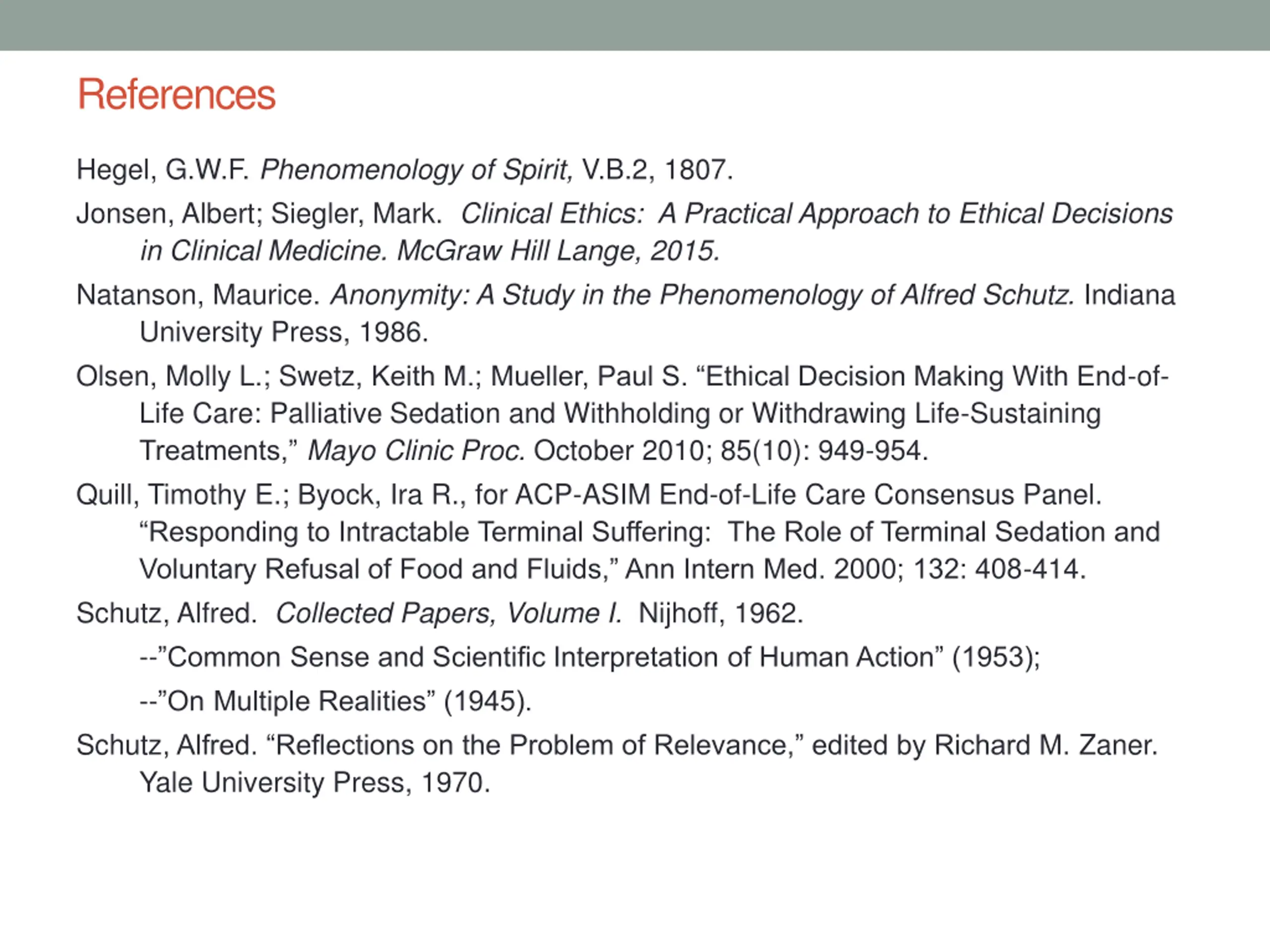 References Hegel, G.W.F. Phenomenology of Spirit, V.B.2, 1807. Jonsen, Albert; Siegler, Mark. Clinical Ethics: A Practical Approach to Ethical Decisions in Clinical Medicine. McGraw Hill Lange, 2015. Natanson, Maurice. Anonymity: A Study in the Phenomenology of Alfred Schutz. Indiana University Press, 1986. Olsen, Molly L.; Swetz, Keith M.; Mueller, Paul S. Ethical Decision Making With End-of- Life Care: Palliative Sedation and Withholding or Withdrawing Life-Sustaining Treatments, Mayo Clinic Proc. October 2010; 85(10): 949-954. Quill, Timothy E.; Byock, Ira R., for ACP-ASIM End-of-Life Care Consensus Panel. Responding to Intractable Terminal Suffering: The Role of Terminal Sedation and Voluntary Refusal of Food and Fluids, Ann Intern Med. 2000; 132: 408-414. Schutz, Alfred. Collected Papers, Volume I. Nijhoff, 1962. -- Common Sense and Scientific Interpretation of Human Action (1953); -- On Multiple Realities (1945). Schutz, Alfred. Reflections on the Problem of Relevance, edited by Richard M. Zaner. Yale University Press, 1970.