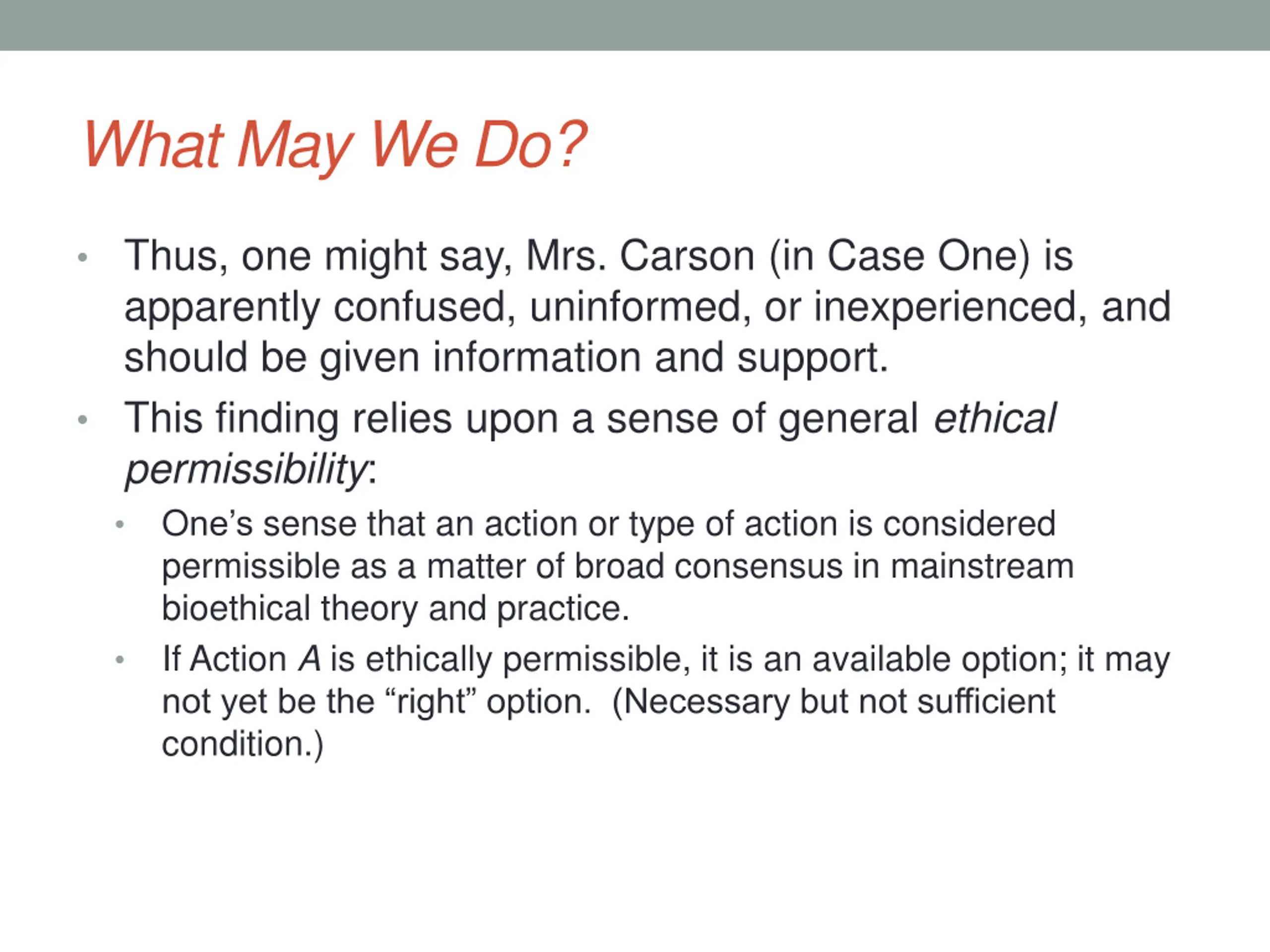 What May We Do? Thus, one might say, Mrs. Carson (in Case One) is apparently confused, uninformed, or inexperienced, and should be given information and support. This finding relies upon a sense of general ethical permissibility: One s sense that an action or type of action is considered permissible as a matter of broad consensus in mainstream bioethical theory and practice. If Action A is ethically permissible, it is an available option; it may not yet be the right option. (Necessary but not sufficient condition.)