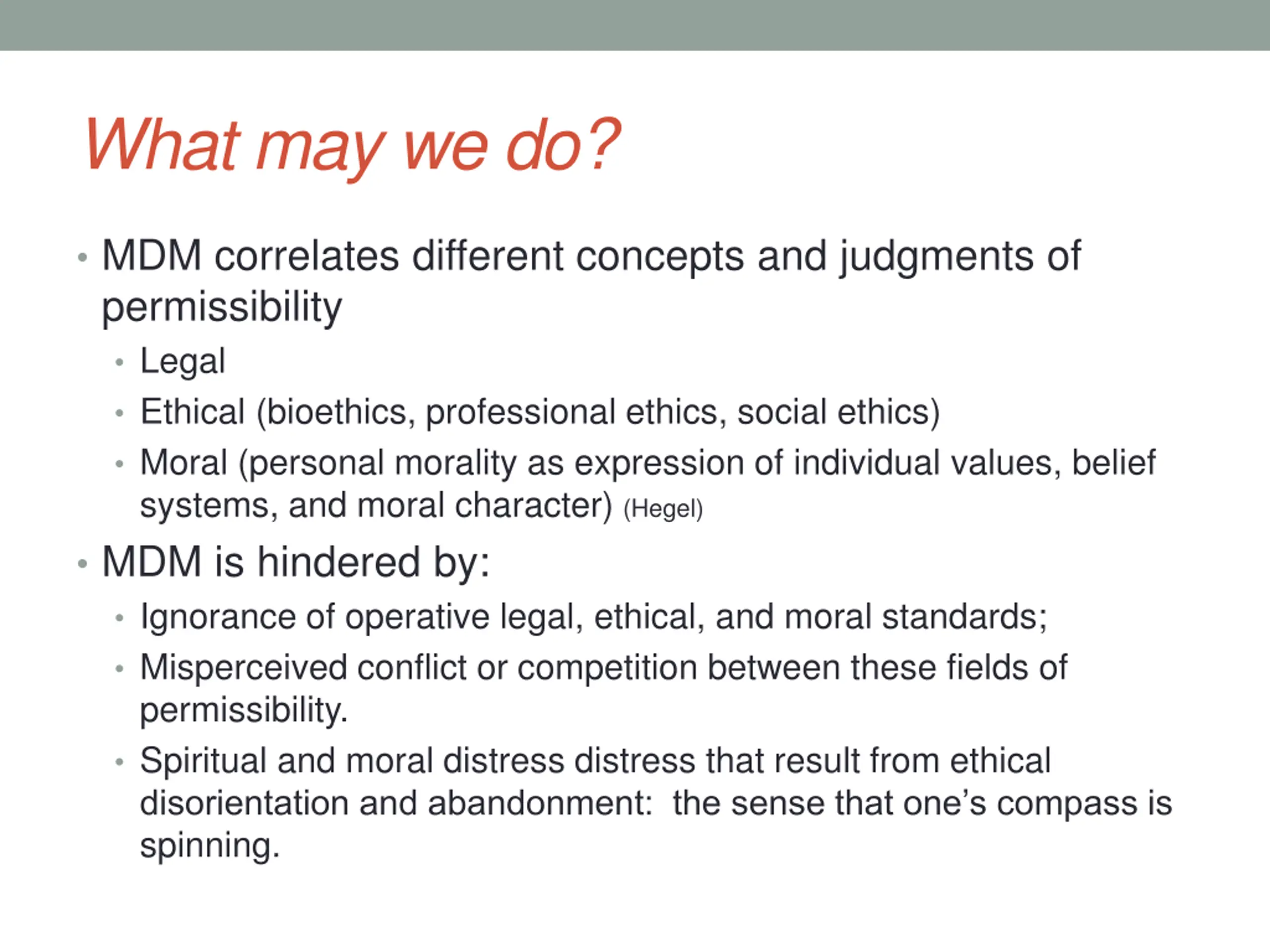 What may we do? MDM correlates different concepts and judgments of permissibility Legal Ethical (bioethics, professional ethics, social ethics) Moral (personal morality as expression of individual values, belief systems, and moral character) (Hegel) MDM is hindered by: Ignorance of operative legal, ethical, and moral standards; Misperceived conflict or competition between these fields of permissibility. Spiritual and moral distress distress that result from ethical disorientation and abandonment: the sense that one s compass is spinning.