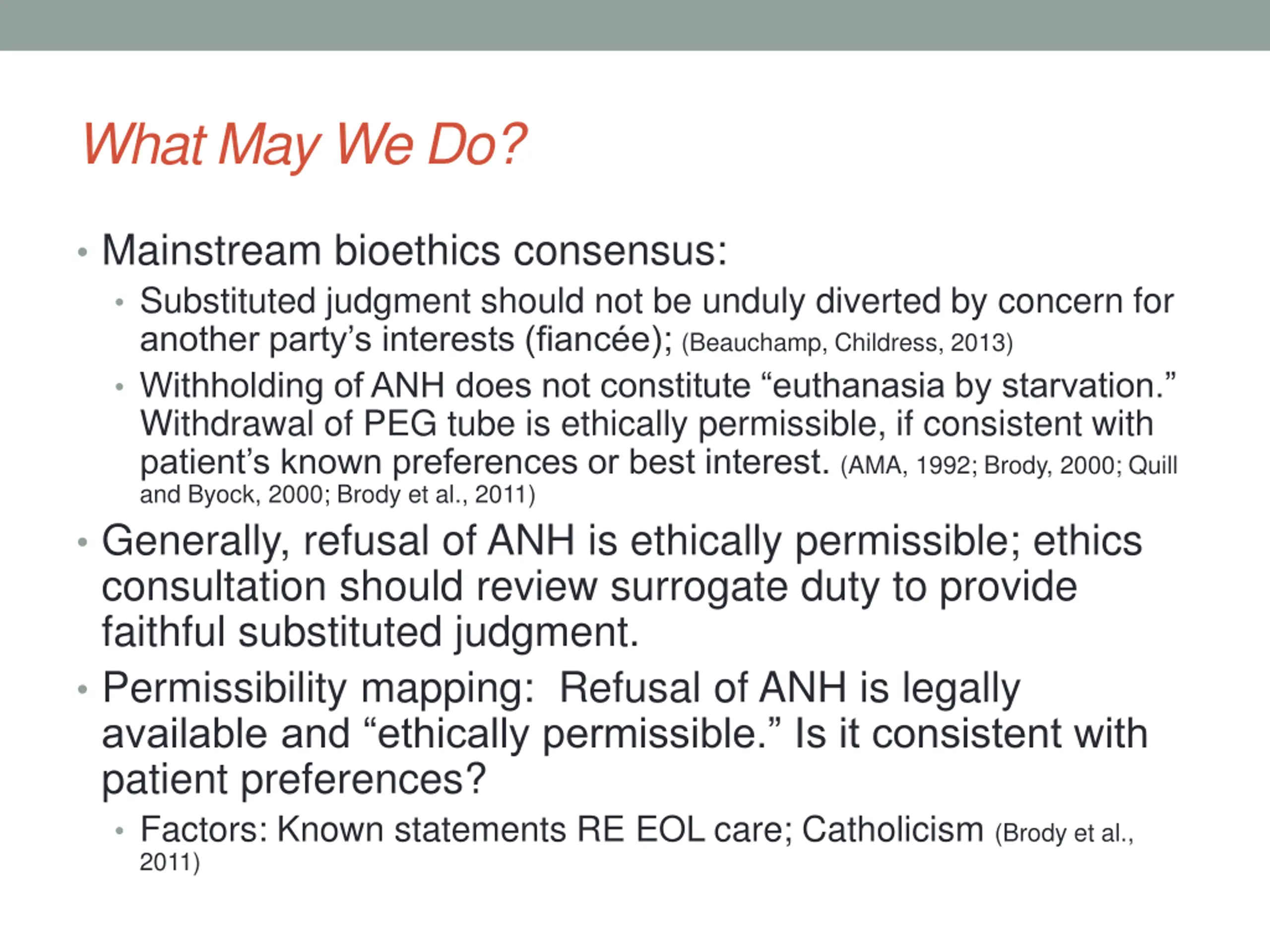 What May We Do? Mainstream bioethics consensus: Substituted judgment should not be unduly diverted by concern for another party s interests (fianc e); (Beauchamp, Childress, 2013) Withholding of ANH does not constitute euthanasia by starvation. Withdrawal of PEG tube is ethically permissible, if consistent with patient s known preferences or best interest. (AMA, 1992; Brody, 2000; Quill and Byock, 2000; Brody et al., 2011) Generally, refusal of ANH is ethically permissible; ethics consultation should review surrogate duty to provide faithful substituted judgment. Permissibility mapping: Refusal of ANH is legally available and ethically permissible. Is it consistent with patient preferences? Factors: Known statements RE EOL care; Catholicism (Brody et al., 2011)