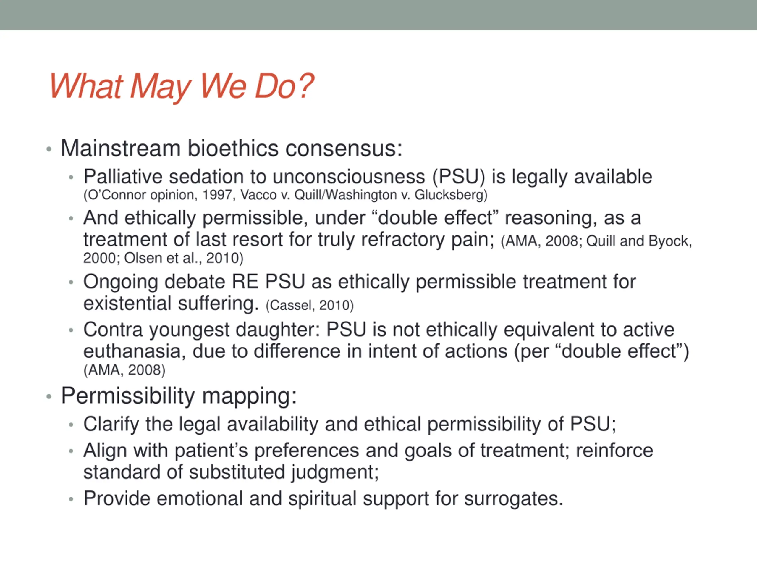 What May We Do? Mainstream bioethics consensus: Palliative sedation to unconsciousness (PSU) is legally available (O Connor opinion, 1997, Vacco v. Quill/Washington v. Glucksberg) And ethically permissible, under double effect reasoning, as a treatment of last resort for truly refractory pain; (AMA, 2008; Quill and Byock, 2000; Olsen et al., 2010) Ongoing debate RE PSU as ethically permissible treatment for existential suffering. (Cassel, 2010) Contra youngest daughter: PSU is not ethically equivalent to active euthanasia, due to difference in intent of actions (per double effect ) (AMA, 2008) Permissibility mapping: Clarify the legal availability and ethical permissibility of PSU; Align with patient s preferences and goals of treatment; reinforce standard of substituted judgment; Provide emotional and spiritual support for surrogates.