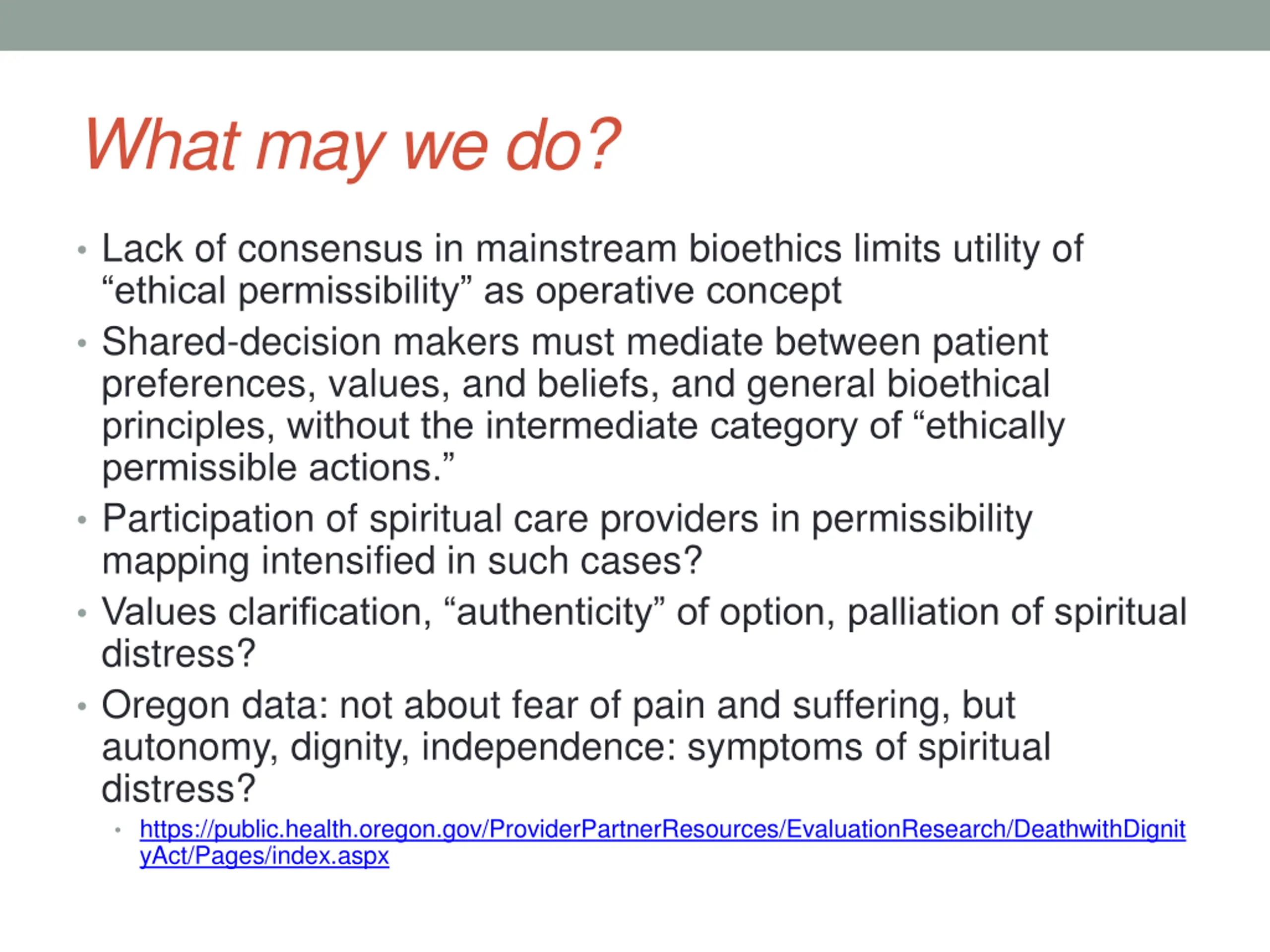 What may we do? Lack of consensus in mainstream bioethics limits utility of ethical permissibility as operative concept Shared-decision makers must mediate between patient preferences, values, and beliefs, and general bioethical principles, without the intermediate category of ethically permissible actions. Participation of spiritual care providers in permissibility mapping intensified in such cases? Values clarification, authenticity of option, palliation of spiritual distress? Oregon data: not about fear of pain and suffering, but autonomy, dignity, independence: symptoms of spiritual distress? https://public.health.oregon.gov/ProviderPartnerResources/EvaluationResearch/DeathwithDignit yAct/Pages/index.aspx