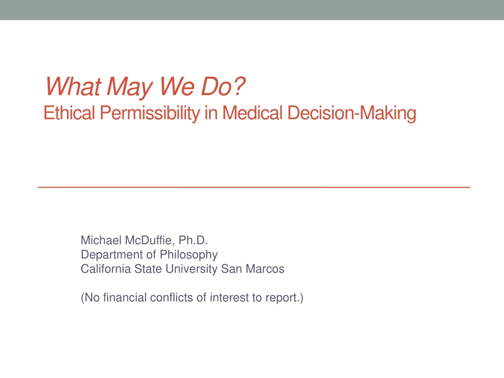 What May We Do? Ethical Permissibility in Medical Decision-Making Michael McDuffie, Ph.D. Department of Philosophy California State University San Marcos (No financial conflicts of interest to report.)