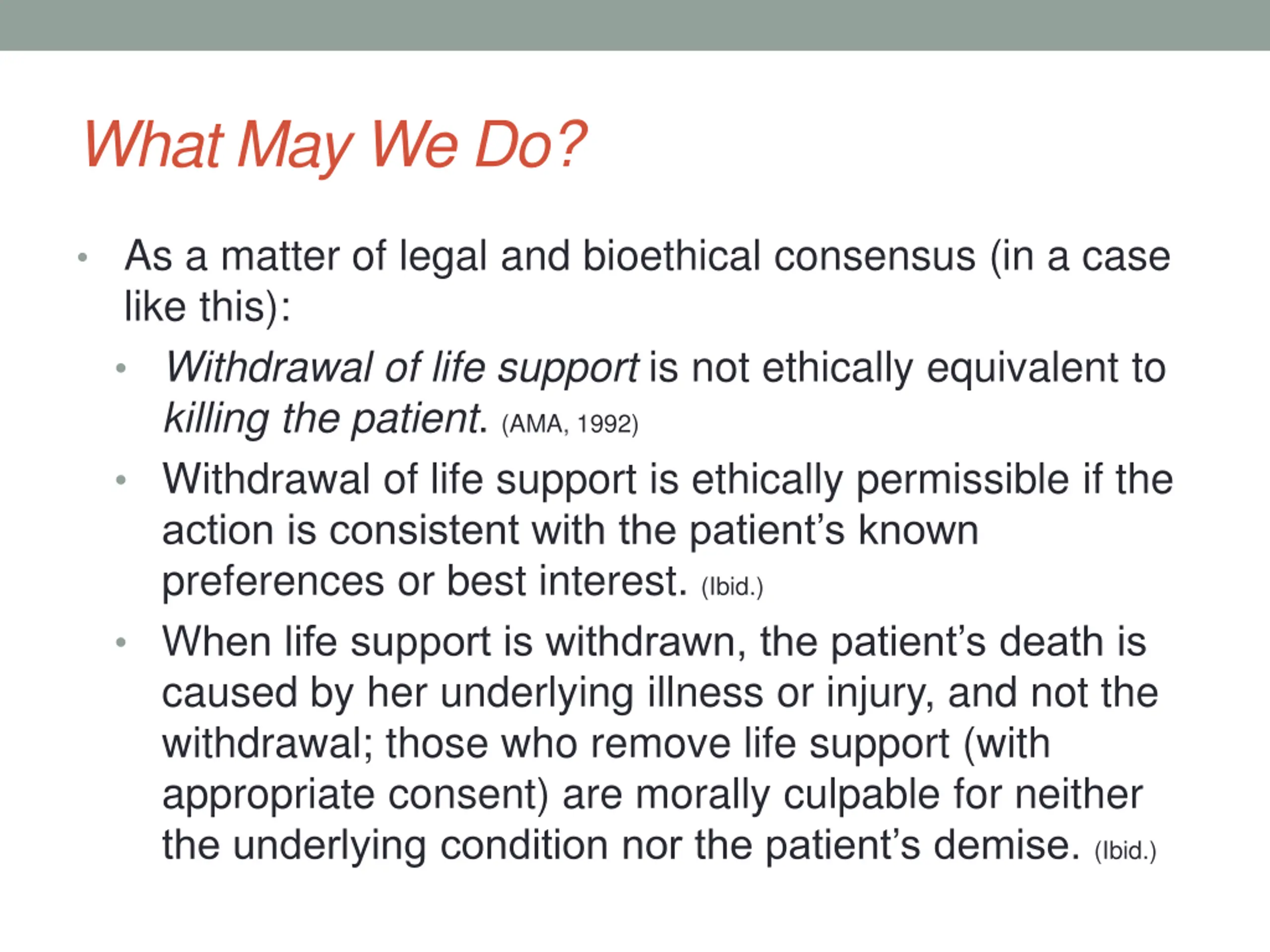 What May We Do? As a matter of legal and bioethical consensus (in a case like this): Withdrawal of life support is not ethically equivalent to killing the patient. (AMA, 1992) Withdrawal of life support is ethically permissible if the action is consistent with the patient s known preferences or best interest. (Ibid.) When life support is withdrawn, the patient s death is caused by her underlying illness or injury, and not the withdrawal; those who remove life support (with appropriate consent) are morally culpable for neither the underlying condition nor the patient s demise. (Ibid.)