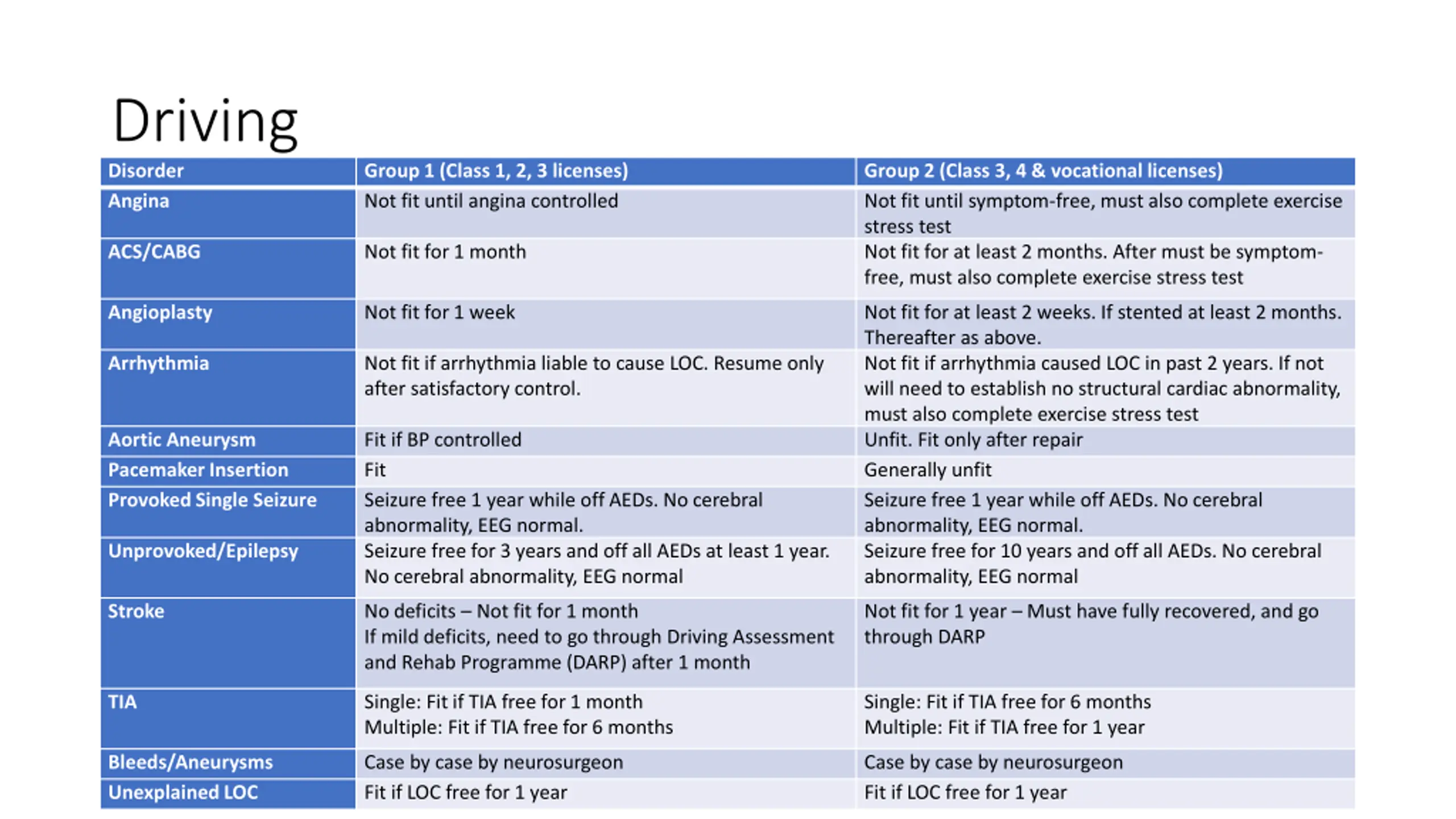 Driving Disorder Angina Group 1 (Class 1, 2, 3 licenses) Not fit until angina controlled Group 2 (Class 3, 4 & vocational licenses) Not fit until symptom-free, must also complete exercise stress test Not fit for at least 2 months. After must be symptom- free, must also complete exercise stress test ACS/CABG Not fit for 1 month Angioplasty Not fit for 1 week Not fit for at least 2 weeks. If stented at least 2 months. Thereafter as above. Not fit if arrhythmia caused LOC in past 2 years. If not will need to establish no structural cardiac abnormality, must also complete exercise stress test Unfit. Fit only after repair Generally unfit Seizure free 1 year while off AEDs. No cerebral abnormality, EEG normal. Seizure free for 10 years and off all AEDs. No cerebral abnormality, EEG normal Arrhythmia Not fit if arrhythmia liable to cause LOC. Resume only after satisfactory control. Aortic Aneurysm Pacemaker Insertion Provoked Single Seizure Fit if BP controlled Fit Seizure free 1 year while off AEDs. No cerebral abnormality, EEG normal. Seizure free for 3 years and off all AEDs at least 1 year. No cerebral abnormality, EEG normal Unprovoked/Epilepsy Stroke No deficits Not fit for 1 month If mild deficits, need to go through Driving Assessment and Rehab Programme (DARP) after 1 month Not fit for 1 year Must have fully recovered, and go through DARP TIA Single: Fit if TIA free for 1 month Multiple: Fit if TIA free for 6 months Single: Fit if TIA free for 6 months Multiple: Fit if TIA free for 1 year Bleeds/Aneurysms Unexplained LOC Case by case by neurosurgeon Fit if LOC free for 1 year Case by case by neurosurgeon Fit if LOC free for 1 year