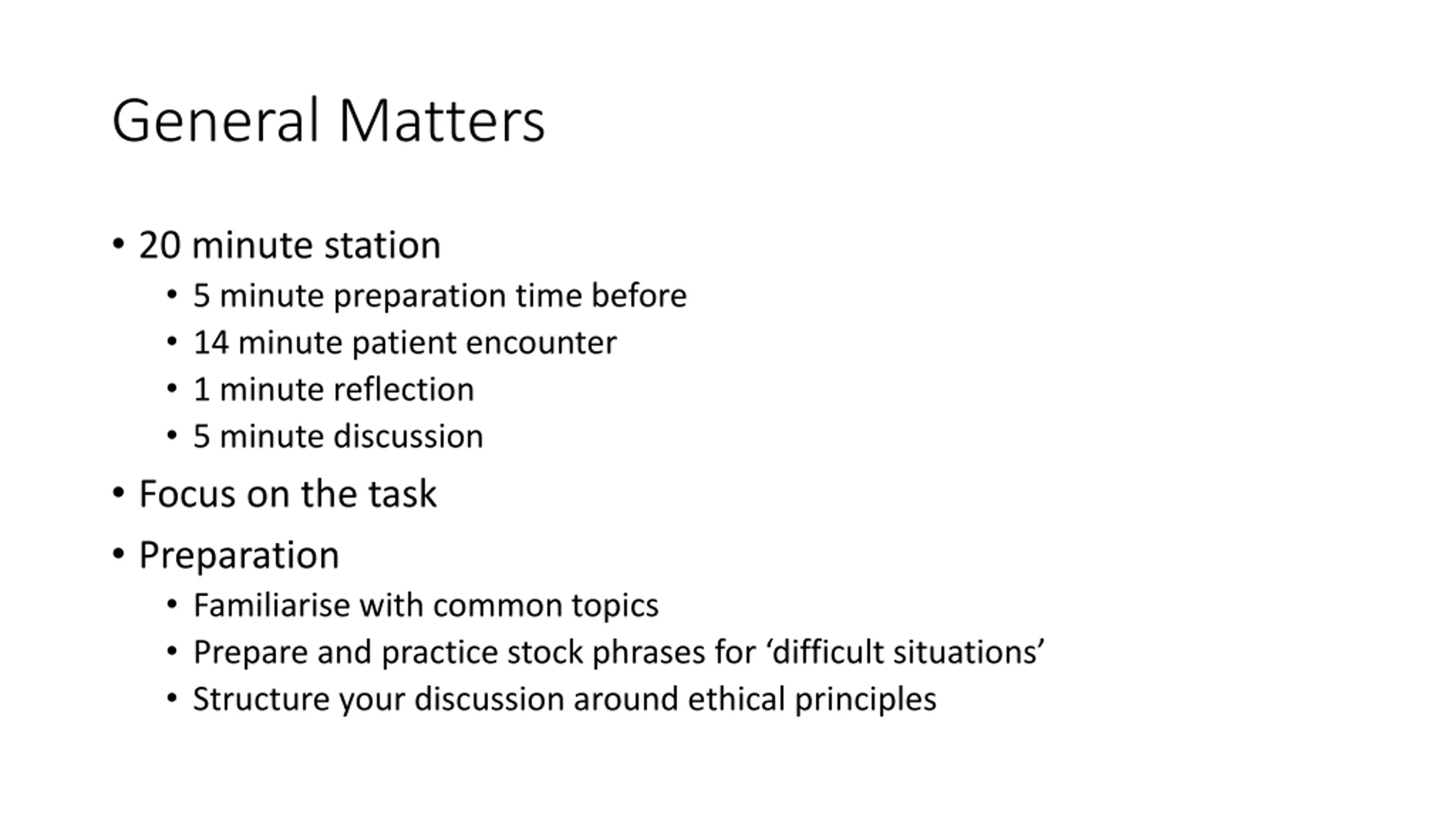General Matters 20 minute station 5 minute preparation time before 14 minute patient encounter 1 minute reflection 5 minute discussion Focus on the task Preparation Familiarise with common topics Prepare and practice stock phrases for difficult situations Structure your discussion around ethical principles
