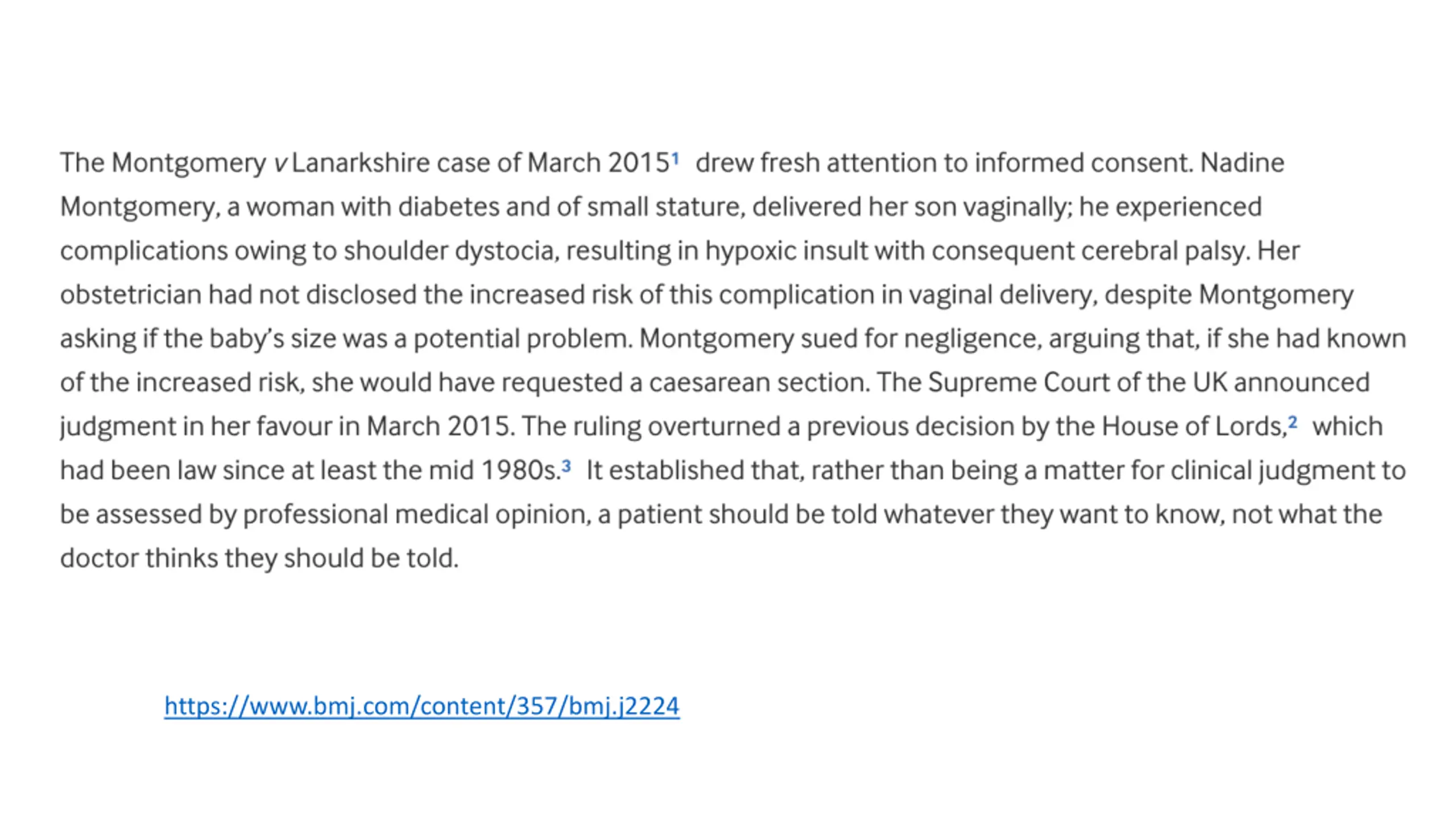 Ethical Principles Negligence: Duty of care, breach of duty, harm as a result of breach Bolam Test (applicable for diagnosis and treatment): a doctor is not negligent if the act is supported by other respected doctors, as long as those doctors opinion is internally consistent and logical. Montgomery Test (for advice): 3 stages 1) Relevant and material info withheld from patient? 2) Was the doctor in possession of the information? if not in possession, use Bolam s test to determine if doctor was negligent in diagnosis/ investigations 3) Was the doctor justified in withholding the info from patient?