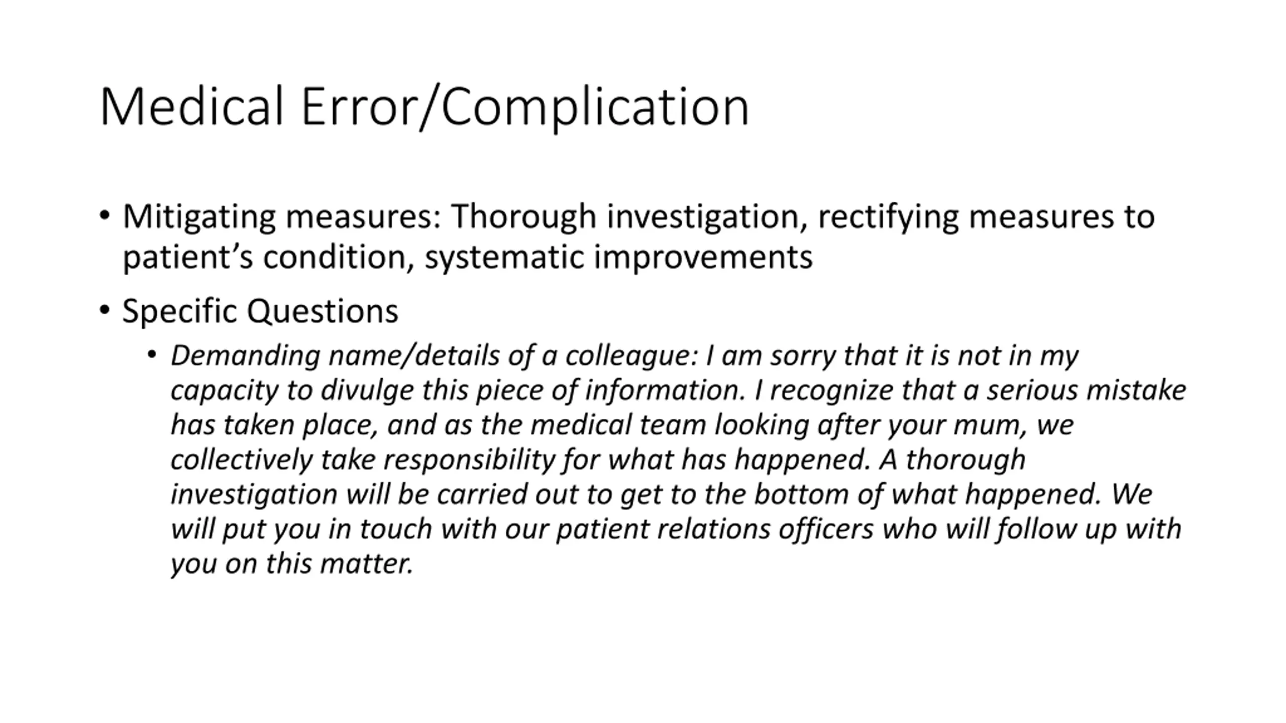 Medical Error/Complication Mitigating measures: Thorough investigation, rectifying measures to patient s condition, systematic improvements Specific Questions Demanding name/details of a colleague: I am sorry that it is not in my capacity to divulge this piece of information. I recognize that a serious mistake has taken place, and as the medical team looking after your mum, we collectively take responsibility for what has happened. A thorough investigation will be carried out to get to the bottom of what happened. We will put you in touch with our patient relations officers who will follow up with you on this matter.