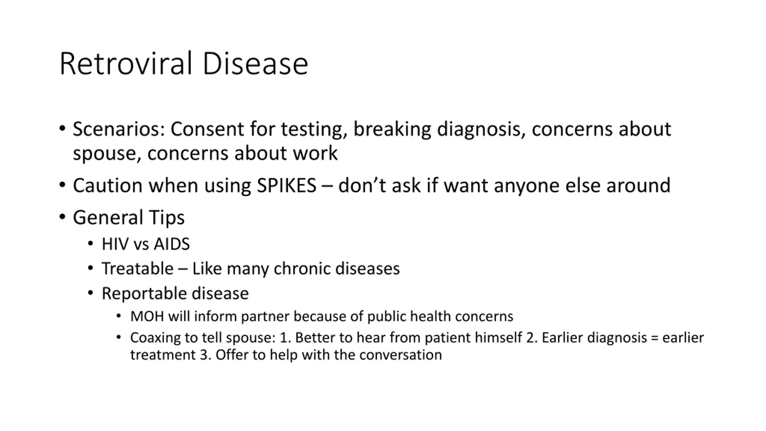 Retroviral Disease Scenarios: Consent for testing, breaking diagnosis, concerns about spouse, concerns about work Caution when using SPIKES don t ask if want anyone else around General Tips HIV vs AIDS Treatable Like many chronic diseases Reportable disease MOH will inform partner because of public health concerns Coaxing to tell spouse: 1. Better to hear from patient himself 2. Earlier diagnosis = earlier treatment 3. Offer to help with the conversation