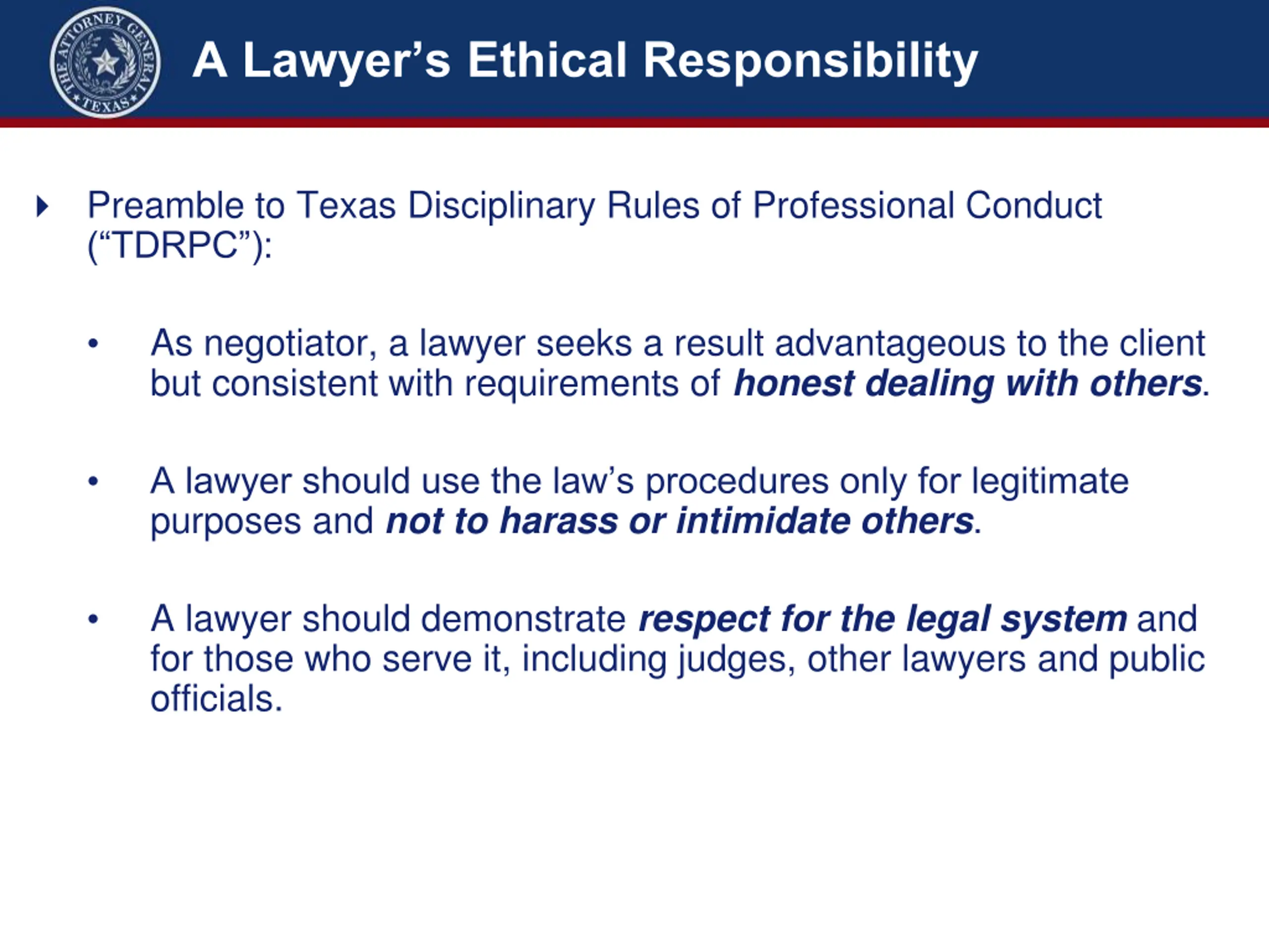 A Lawyers Ethical Responsibility Preamble to Texas Disciplinary Rules of Professional Conduct ( TDRPC ): As negotiator, a lawyer seeks a result advantageous to the client but consistent with requirements of honest dealing with others. A lawyer should use the law s procedures only for legitimate purposes and not to harass or intimidate others. A lawyer should demonstrate respect for the legal system and for those who serve it, including judges, other lawyers and public officials.