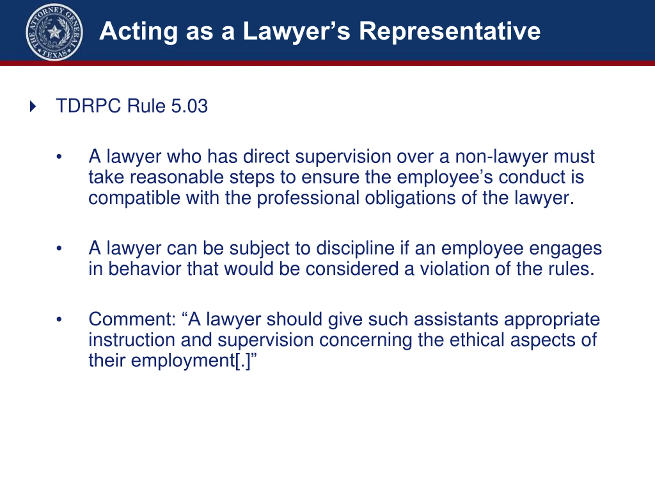 Acting as a Lawyers Representative TDRPC Rule 5.03 A lawyer who has direct supervision over a non-lawyer must take reasonable steps to ensure the employee s conduct is compatible with the professional obligations of the lawyer. A lawyer can be subject to discipline if an employee engages in behavior that would be considered a violation of the rules. Comment: A lawyer should give such assistants appropriate instruction and supervision concerning the ethical aspects of their employment[.]