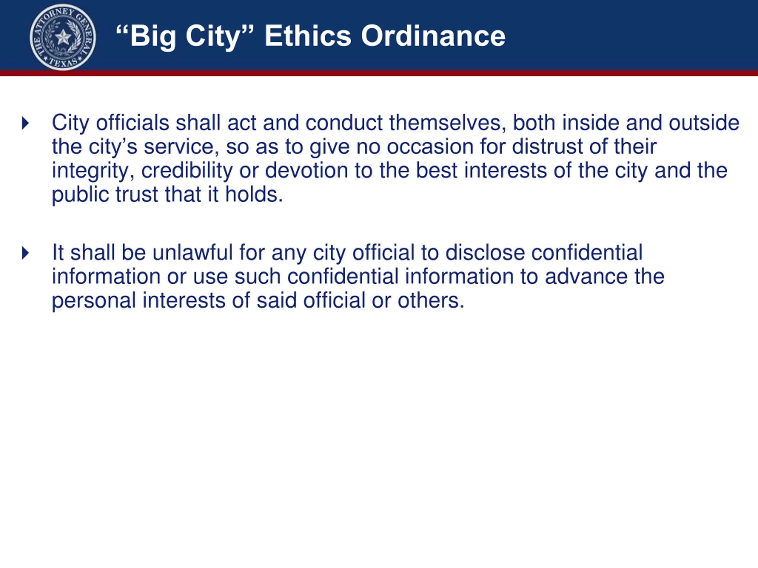 Big City Ethics Ordinance City officials shall act and conduct themselves, both inside and outside the city s service, so as to give no occasion for distrust of their integrity, credibility or devotion to the best interests of the city and the public trust that it holds. It shall be unlawful for any city official to disclose confidential information or use such confidential information to advance the personal interests of said official or others.