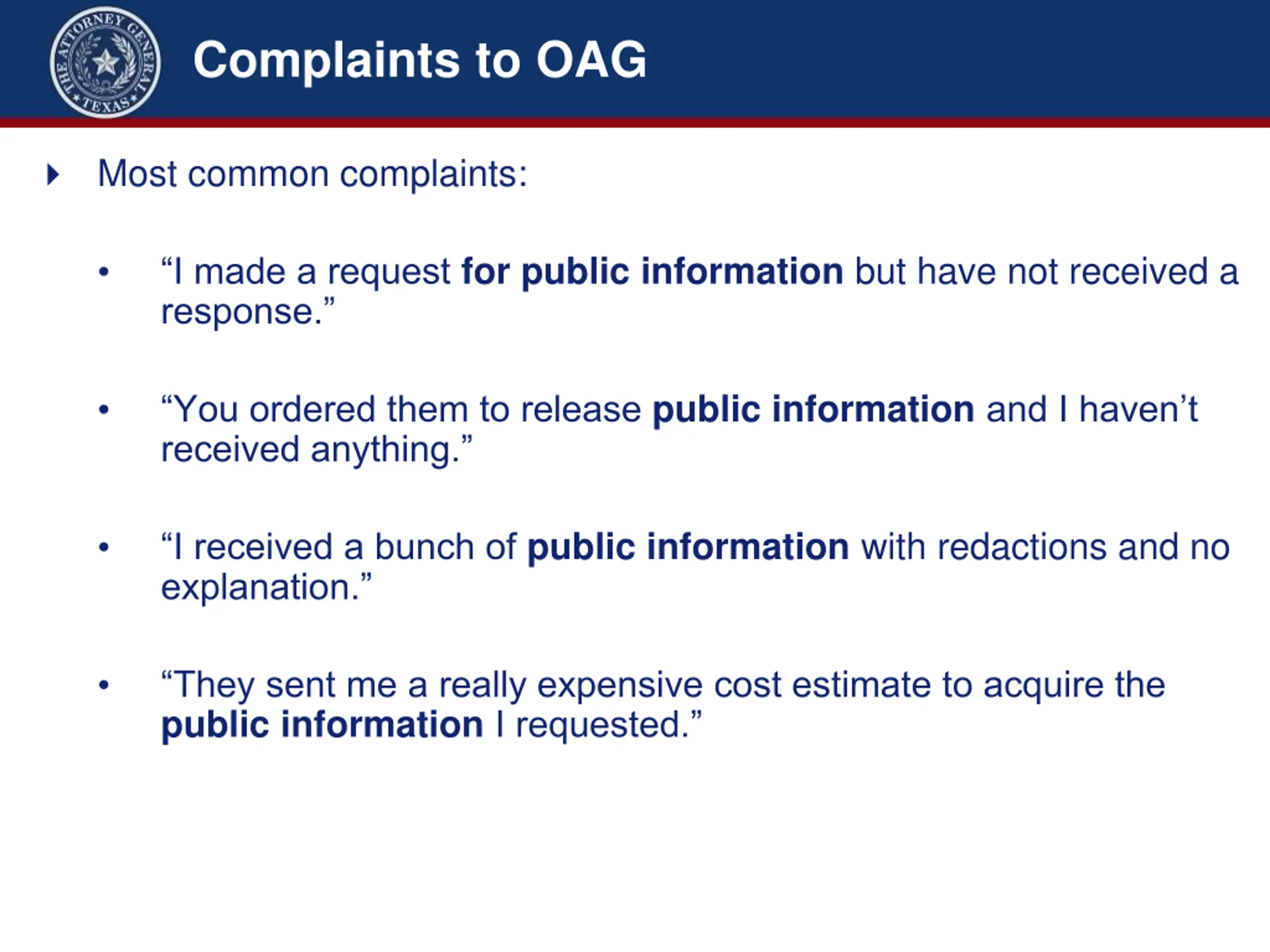 Complaints to OAG Most common complaints: I made a request for public information but have not received a response. You ordered them to release public information and I haven t received anything. I received a bunch of public information with redactions and no explanation. They sent me a really expensive cost estimate to acquire the public information I requested.