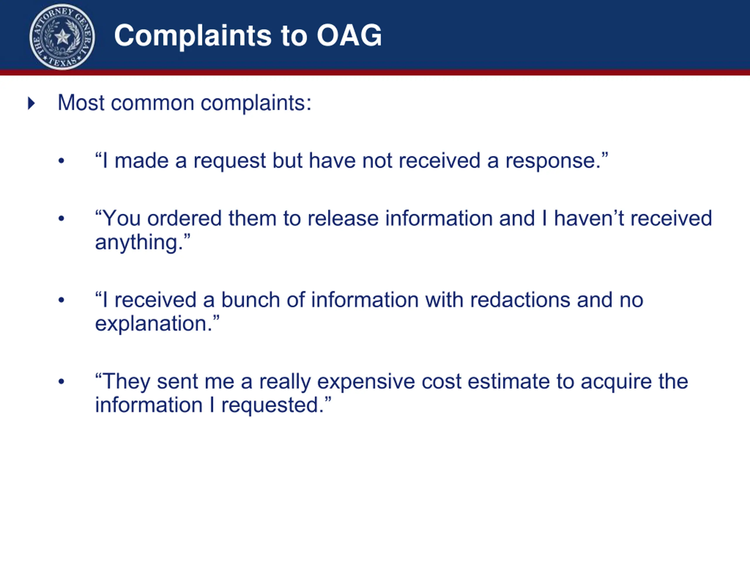 Complaints to OAG Most common complaints: I made a request but have not received a response. You ordered them to release information and I haven t received anything. I received a bunch of information with redactions and no explanation. They sent me a really expensive cost estimate to acquire the information I requested.