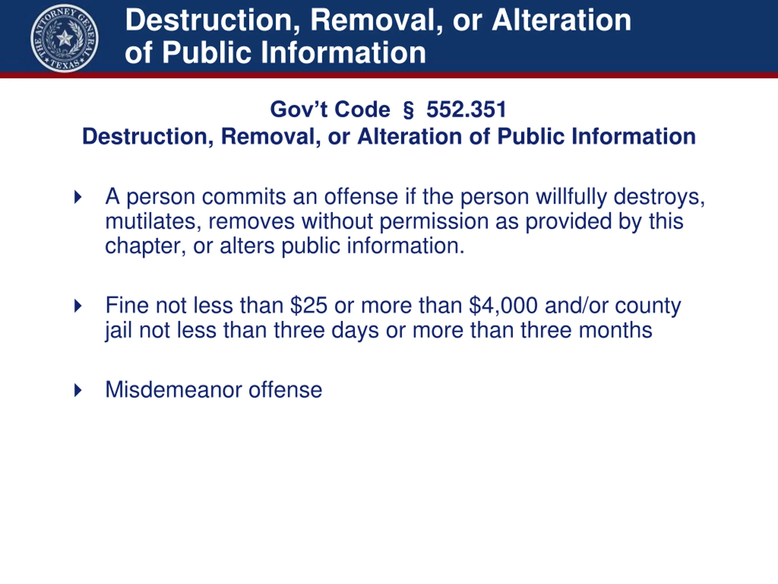 Destruction, Removal, or Alteration of Public Information 552.351 Gov t Code Destruction, Removal, or Alteration of Public Information A person commits an offense if the person willfully destroys, mutilates, removes without permission as provided by this chapter, or alters public information. Fine not less than $25 or more than $4,000 and/or county jail not less than three days or more than three months Misdemeanor offense