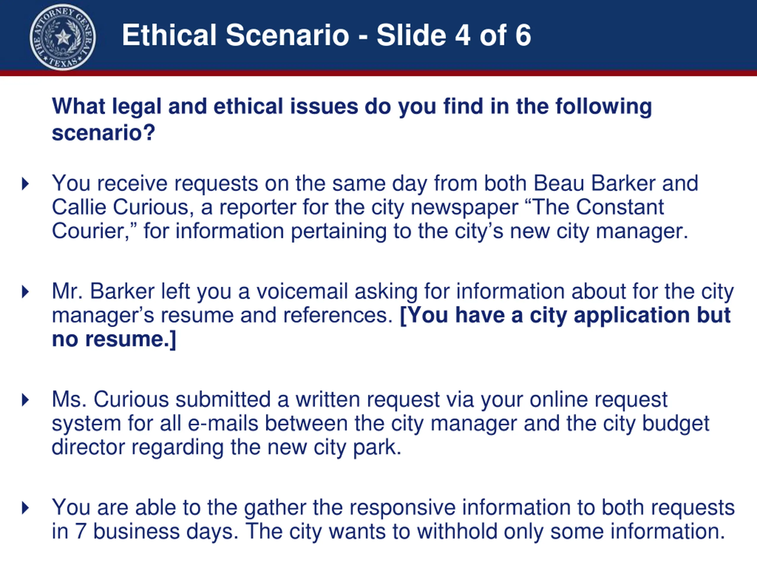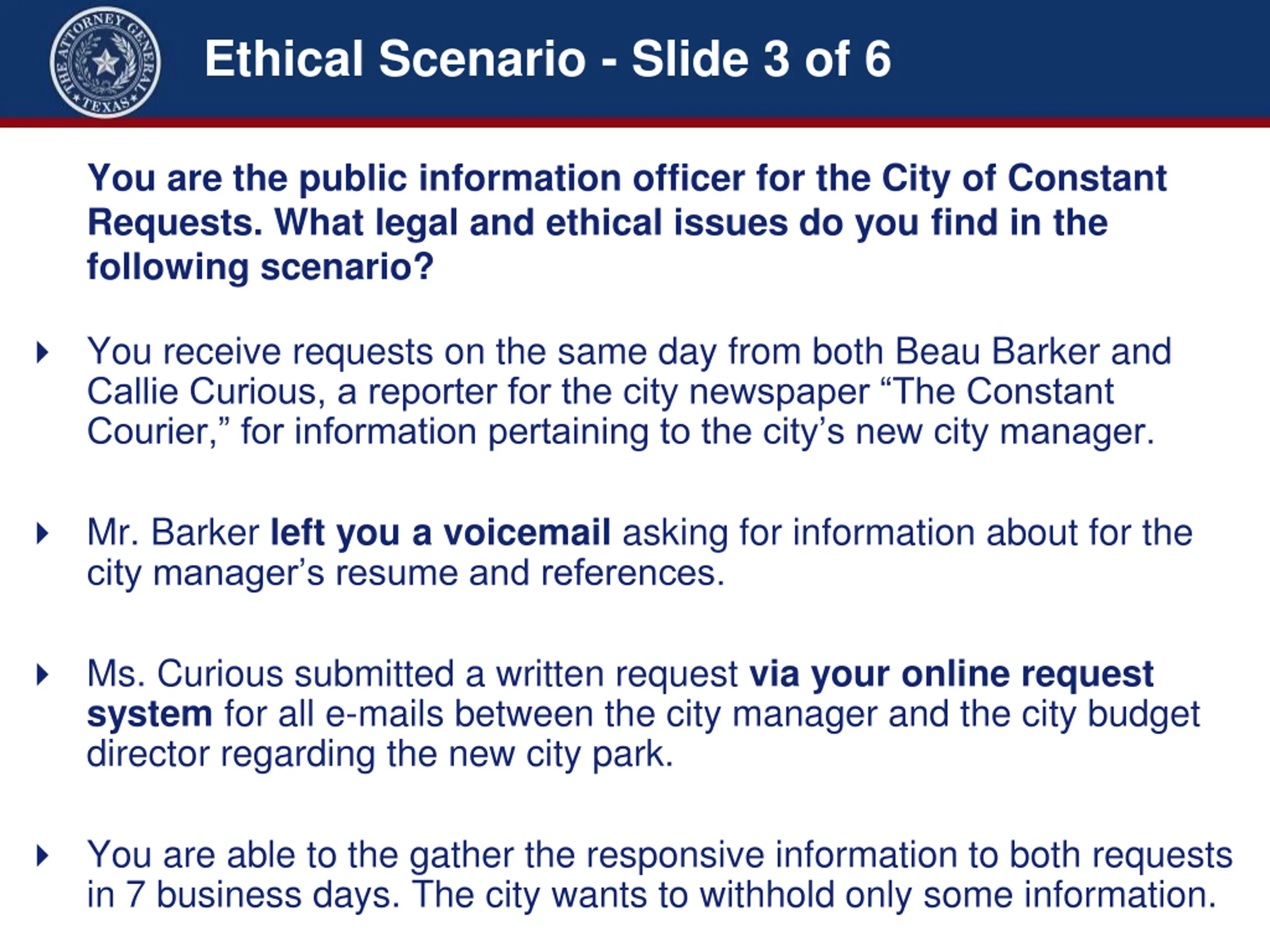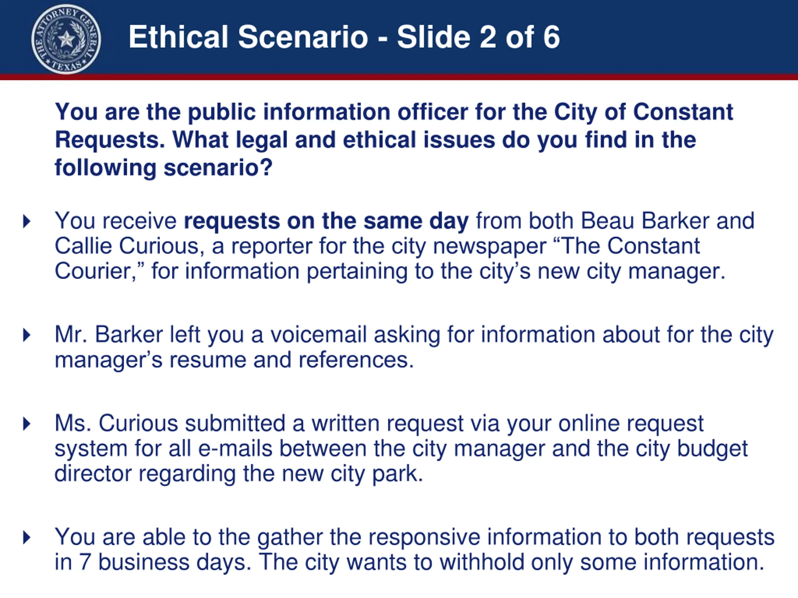 Ethical Scenario - Slide 3 of 6 You are the public information officer for the City of Constant Requests. What legal and ethical issues do you find in the following scenario? You receive requests on the same day from both Beau Barker and Callie Curious, a reporter for the city newspaper The Constant Courier, for information pertaining to the city s new city manager. Mr. Barker left you a voicemail asking for information about for the city manager s resume and references. Ms. Curious submitted a written request via your online request system for all e-mails between the city manager and the city budget director regarding the new city park. You are able to the gather the responsive information to both requests in 7 business days. The city wants to withhold only some information.