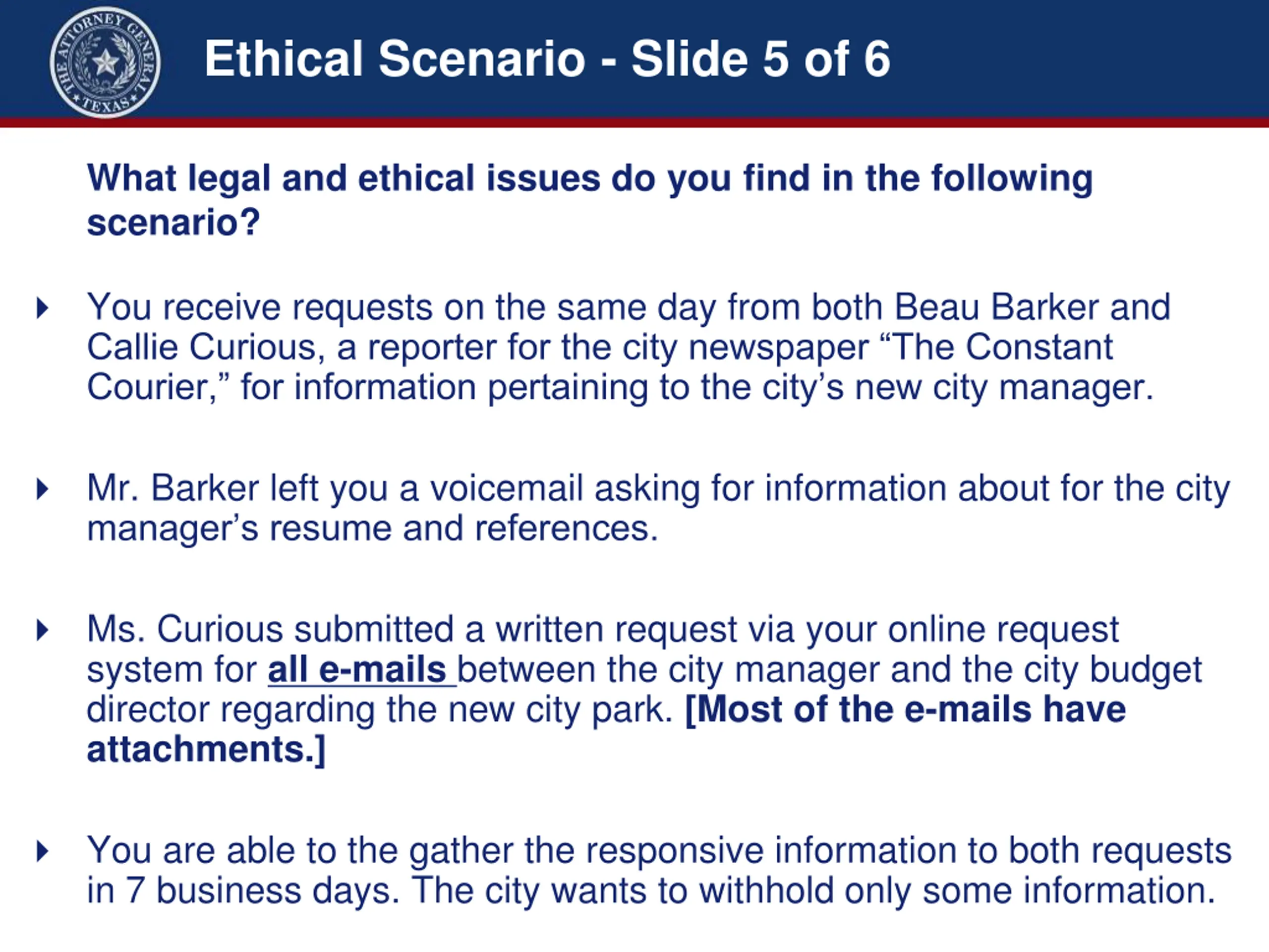 Ethical Scenario - Slide 2 of 6 You are the public information officer for the City of Constant Requests. What legal and ethical issues do you find in the following scenario? You receive requests on the same day from both Beau Barker and Callie Curious, a reporter for the city newspaper The Constant Courier, for information pertaining to the city s new city manager. Mr. Barker left you a voicemail asking for information about for the city manager s resume and references. Ms. Curious submitted a written request via your online request system for all e-mails between the city manager and the city budget director regarding the new city park. You are able to the gather the responsive information to both requests in 7 business days. The city wants to withhold only some information.
