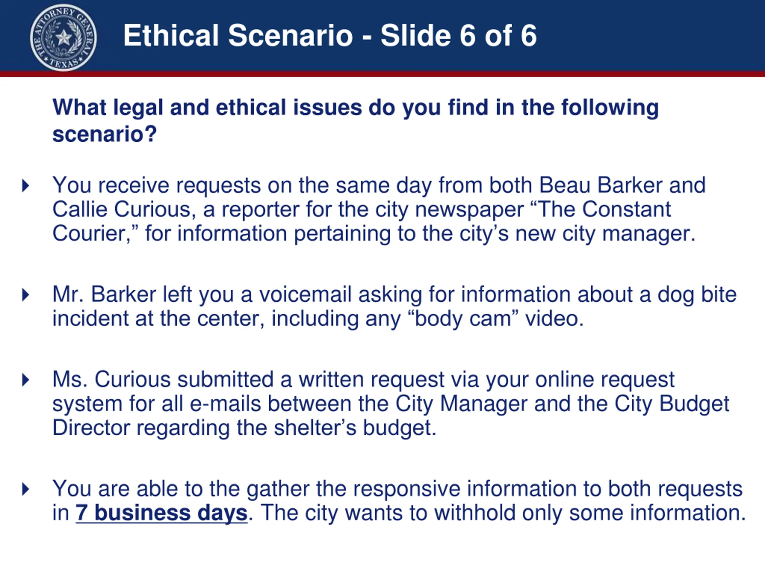 Ethical Scenario - Slide 6 of 6 What legal and ethical issues do you find in the following scenario? You receive requests on the same day from both Beau Barker and Callie Curious, a reporter for the city newspaper The Constant Courier, for information pertaining to the city s new city manager. Mr. Barker left you a voicemail asking for information about a dog bite incident at the center, including any body cam video. Ms. Curious submitted a written request via your online request system for all e-mails between the City Manager and the City Budget Director regarding the shelter s budget. You are able to the gather the responsive information to both requests in 7 business days. The city wants to withhold only some information.