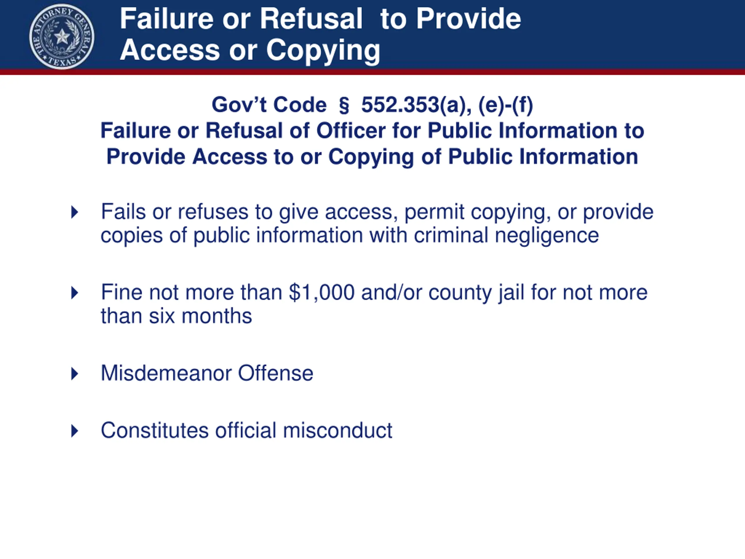 Failure or Refusal to Provide Access or Copying 552.353(a), (e)-(f) Gov t Code Failure or Refusal of Officer for Public Information to Provide Access to or Copying of Public Information Fails or refuses to give access, permit copying, or provide copies of public information with criminal negligence Fine not more than $1,000 and/or county jail for not more than six months Misdemeanor Offense Constitutes official misconduct