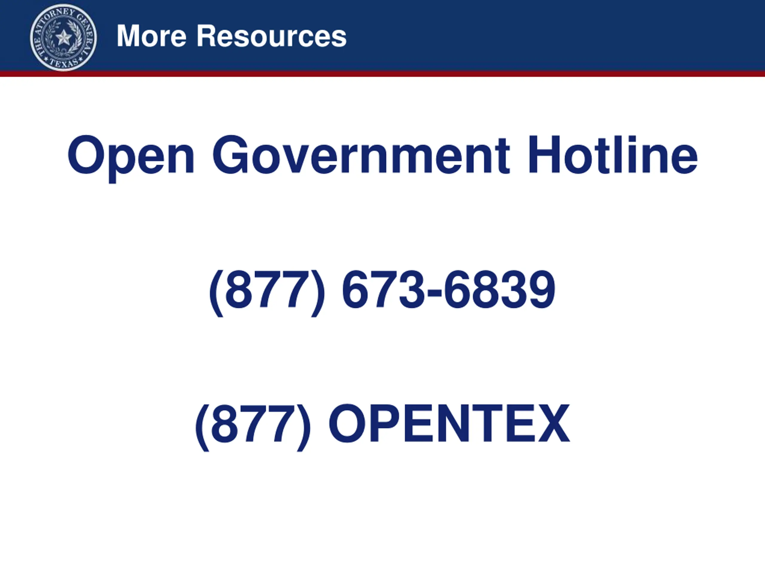 More Resources Open Government Hotline (877) 673-6839 (877) OPENTEX