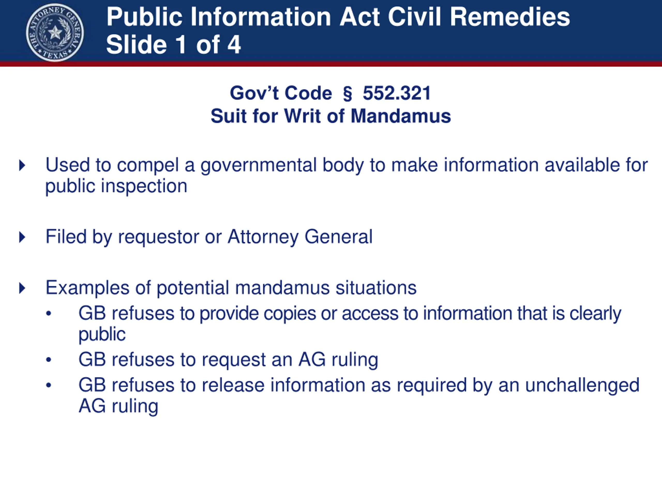 Public Information Act Civil Remedies Slide 1 of 4 552.321 Gov t Code Suit for Writ of Mandamus Used to compel a governmental body to make information available for public inspection Filed by requestor or Attorney General Examples of potential mandamus situations GB refuses to provide copies or access to information that is clearly public GB refuses to request an AG ruling GB refuses to release information as required by an unchallenged AG ruling