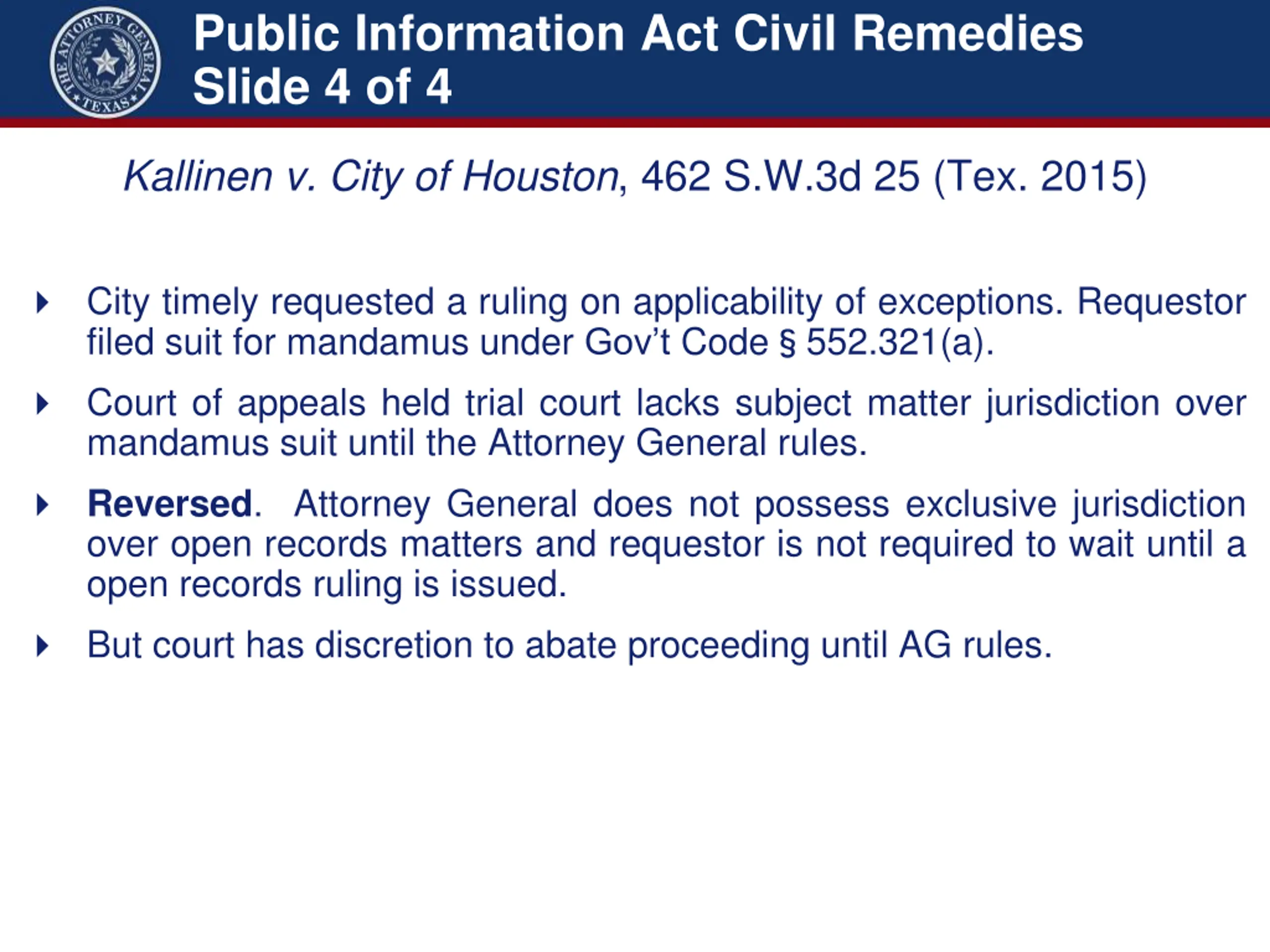 Public Information Act Civil Remedies Slide 4 of 4 Kallinen v. City of Houston, 462 S.W.3d 25 (Tex. 2015) City timely requested a ruling on applicability of exceptions. Requestor filed suit for mandamus under Gov t Code 552.321(a). Court of appeals held trial court lacks subject matter jurisdiction over mandamus suit until the Attorney General rules. Reversed. Attorney General does not possess exclusive jurisdiction over open records matters and requestor is not required to wait until a open records ruling is issued. But court has discretion to abate proceeding until AG rules.