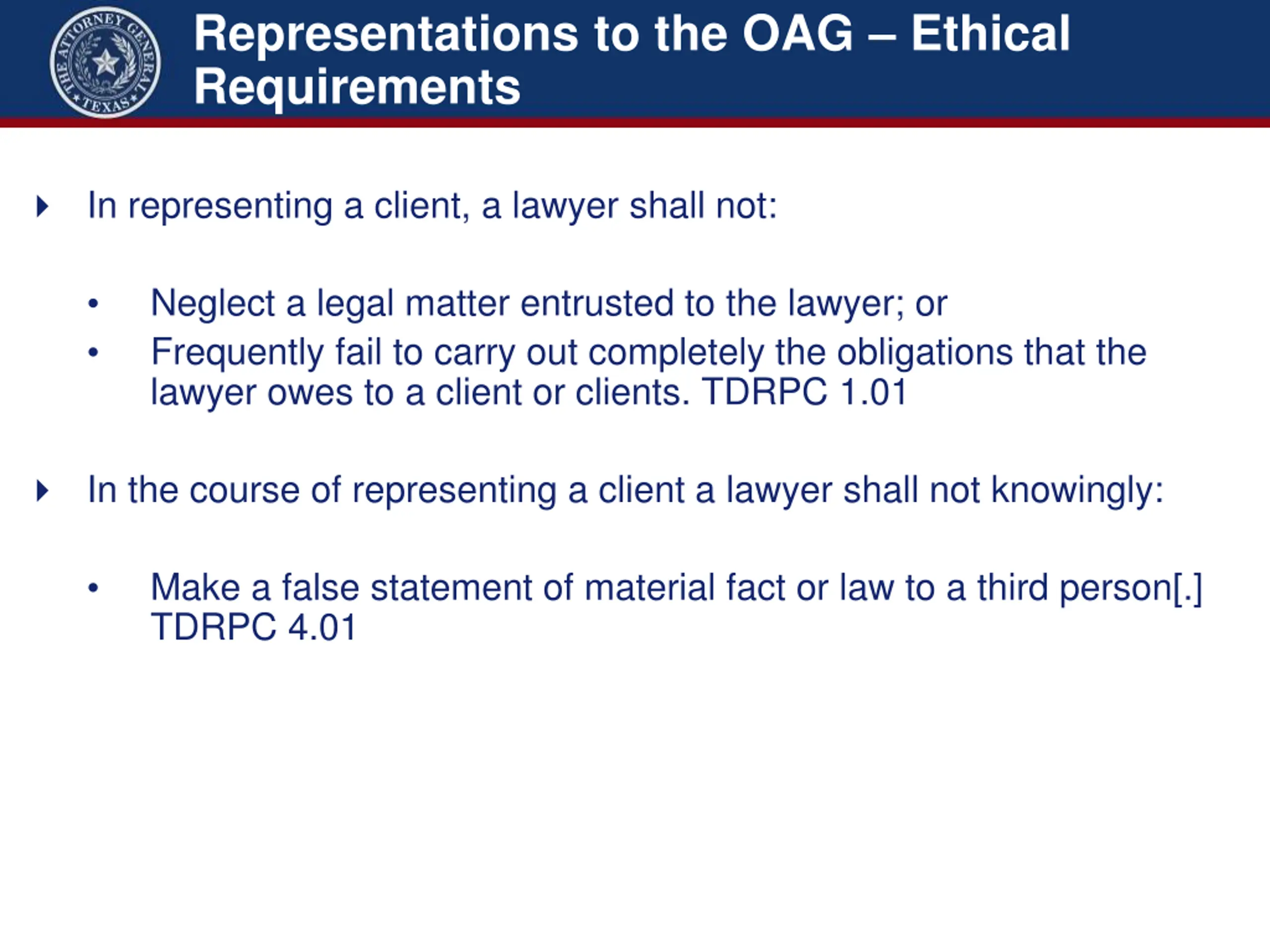 Representations to the OAG Ethical Requirements In representing a client, a lawyer shall not: Neglect a legal matter entrusted to the lawyer; or Frequently fail to carry out completely the obligations that the lawyer owes to a client or clients. TDRPC 1.01 In the course of representing a client a lawyer shall not knowingly: Make a false statement of material fact or law to a third person[.] TDRPC 4.01