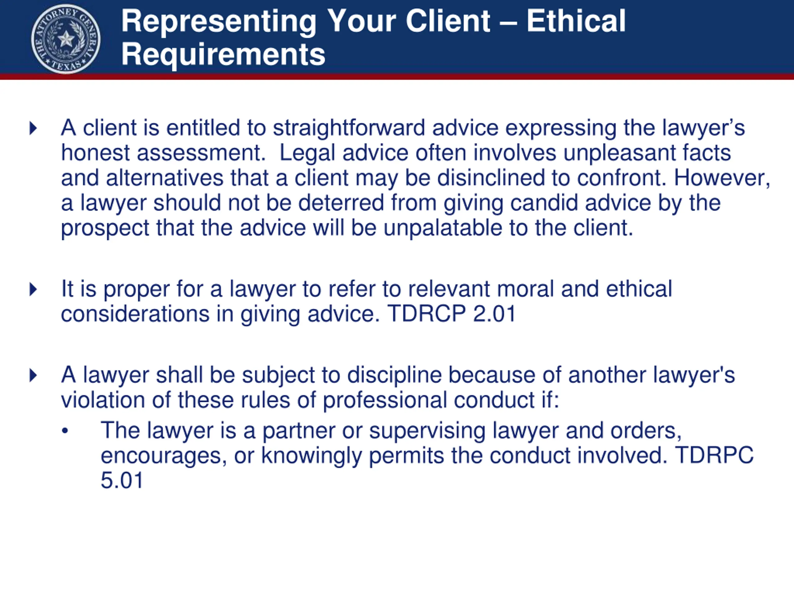 Representing Your Client Ethical Requirements A client is entitled to straightforward advice expressing the lawyer s honest assessment. Legal advice often involves unpleasant facts and alternatives that a client may be disinclined to confront. However, a lawyer should not be deterred from giving candid advice by the prospect that the advice will be unpalatable to the client. It is proper for a lawyer to refer to relevant moral and ethical considerations in giving advice. TDRCP 2.01 A lawyer shall be subject to discipline because of another lawyer's violation of these rules of professional conduct if: The lawyer is a partner or supervising lawyer and orders, encourages, or knowingly permits the conduct involved. TDRPC 5.01