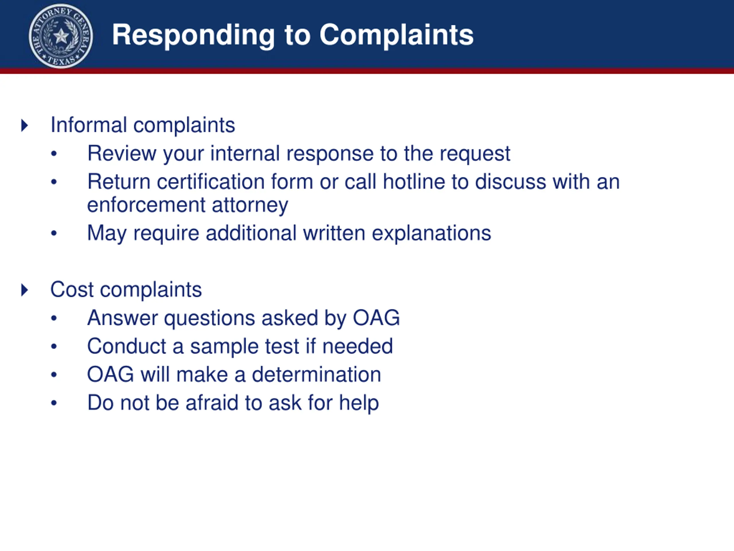 Responding to Complaints Informal complaints Review your internal response to the request Return certification form or call hotline to discuss with an enforcement attorney May require additional written explanations Cost complaints Answer questions asked by OAG Conduct a sample test if needed OAG will make a determination Do not be afraid to ask for help