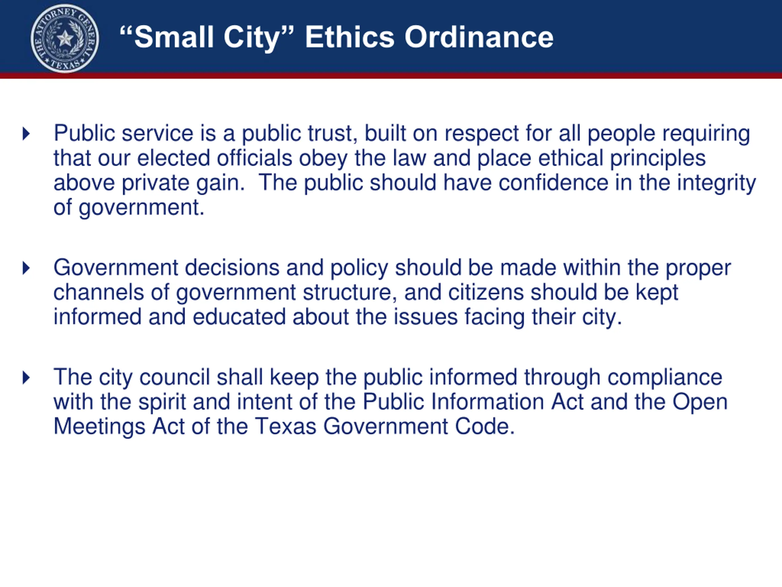 Small City Ethics Ordinance Public service is a public trust, built on respect for all people requiring that our elected officials obey the law and place ethical principles above private gain. The public should have confidence in the integrity of government. Government decisions and policy should be made within the proper channels of government structure, and citizens should be kept informed and educated about the issues facing their city. The city council shall keep the public informed through compliance with the spirit and intent of the Public Information Act and the Open Meetings Act of the Texas Government Code.