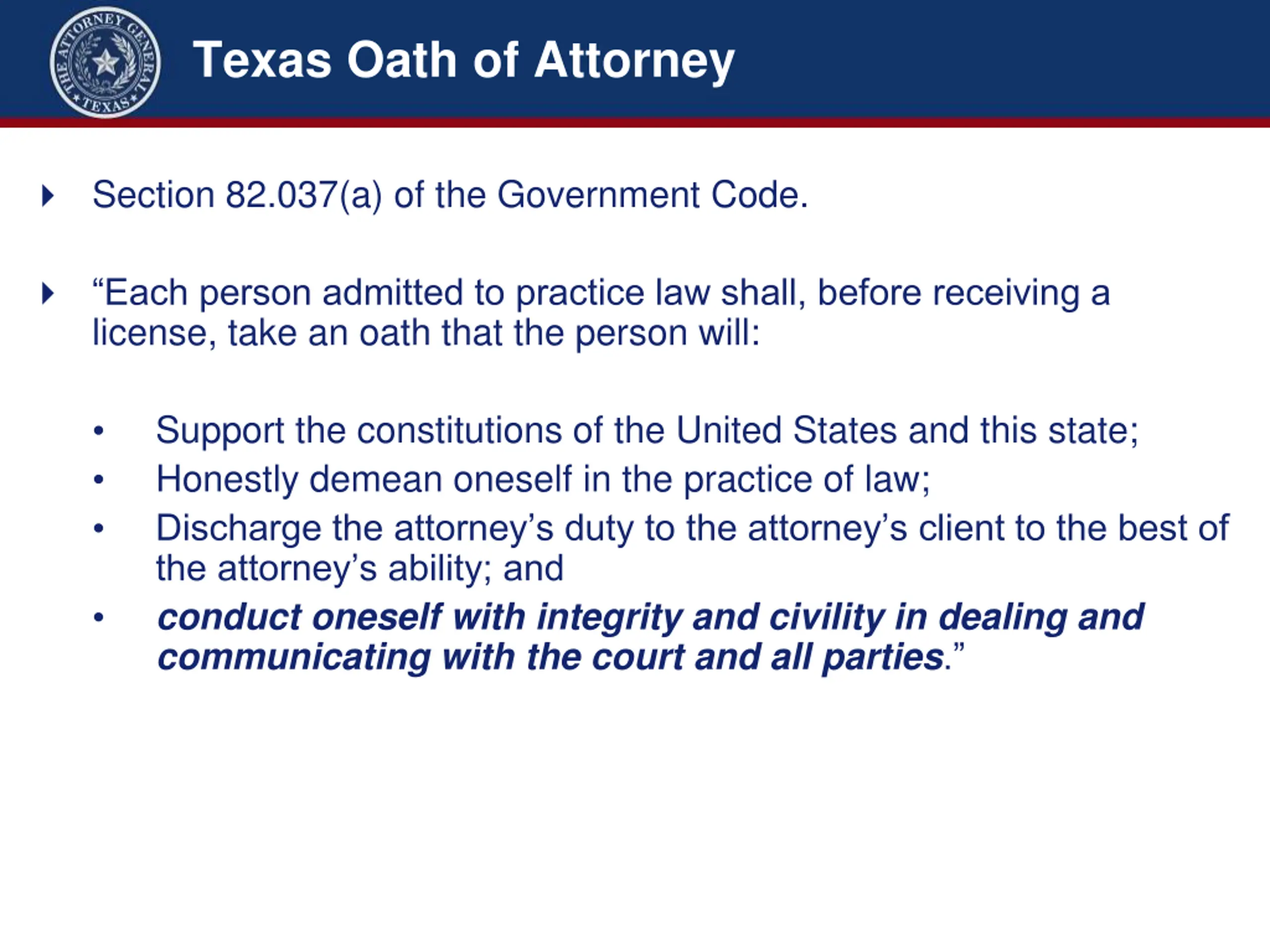 Texas Oath of Attorney Section 82.037(a) of the Government Code. Each person admitted to practice law shall, before receiving a license, take an oath that the person will: Support the constitutions of the United States and this state; Honestly demean oneself in the practice of law; Discharge the attorney s duty to the attorney s client to the best of the attorney s ability; and conduct oneself with integrity and civility in dealing and communicating with the court and all parties.