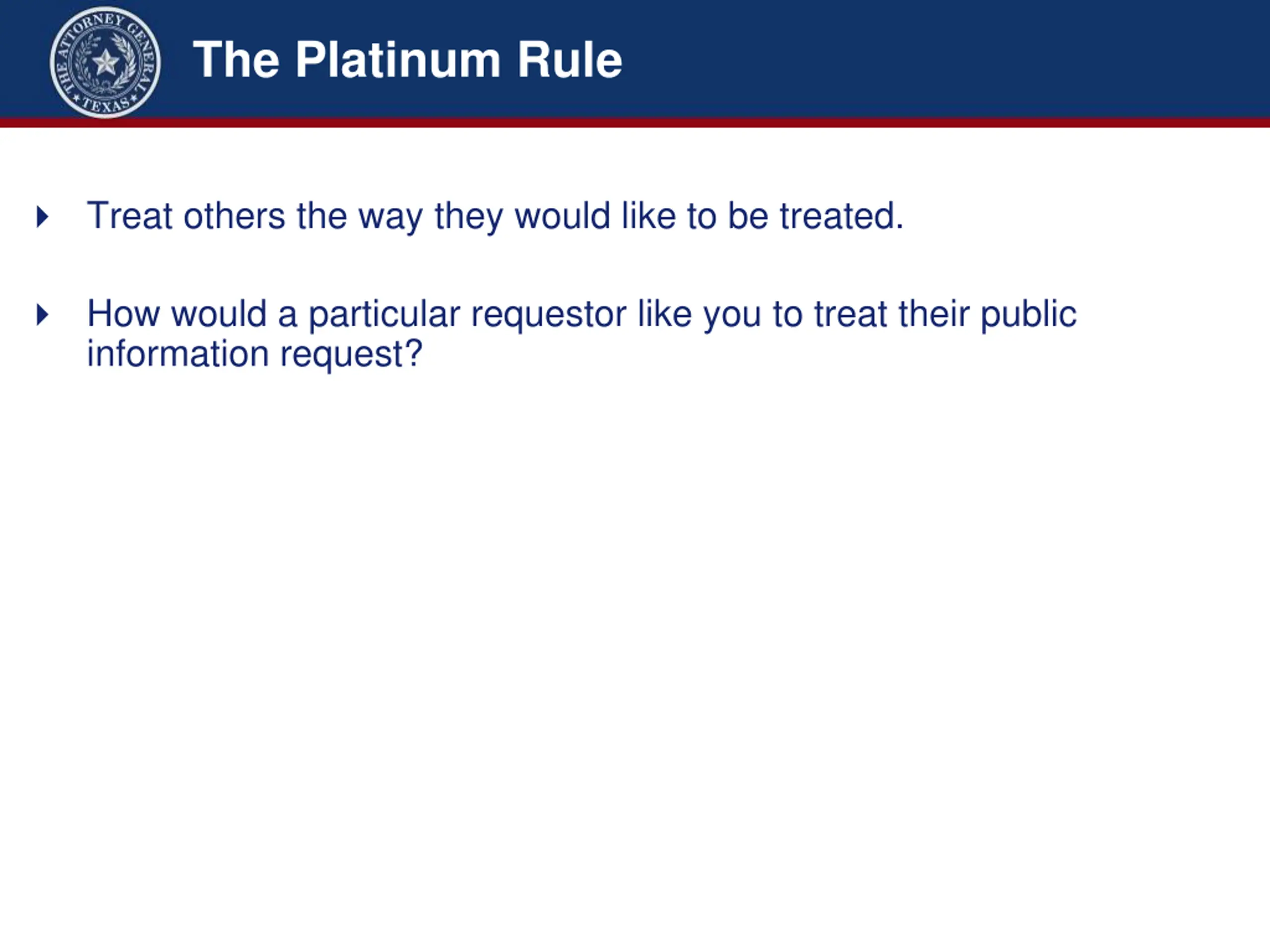 The Platinum Rule Treat others the way they would like to be treated. How would a particular requestor like you to treat their public information request?