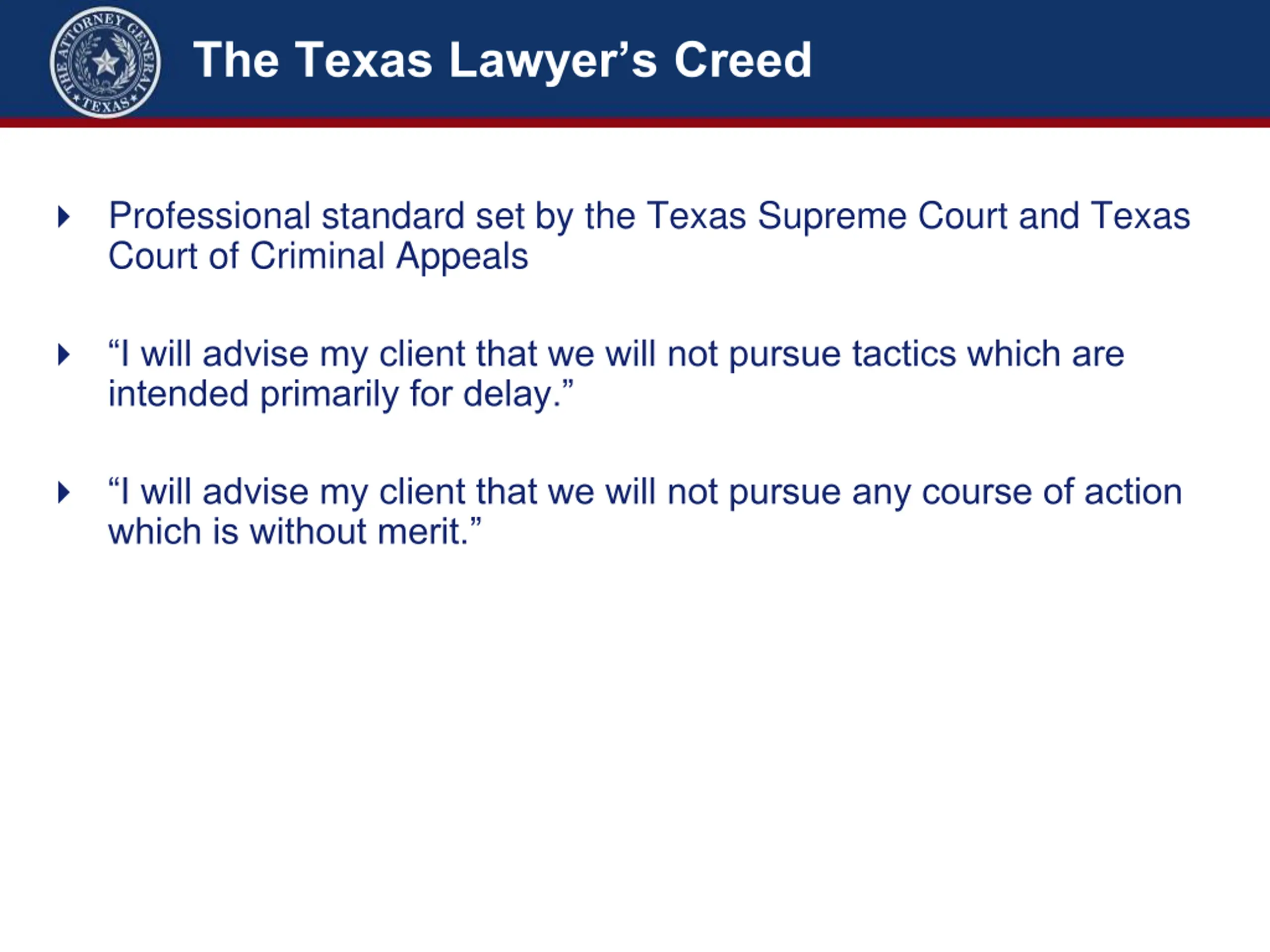 The Texas Lawyers Creed Professional standard set by the Texas Supreme Court and Texas Court of Criminal Appeals I will advise my client that we will not pursue tactics which are intended primarily for delay. I will advise my client that we will not pursue any course of action which is without merit.