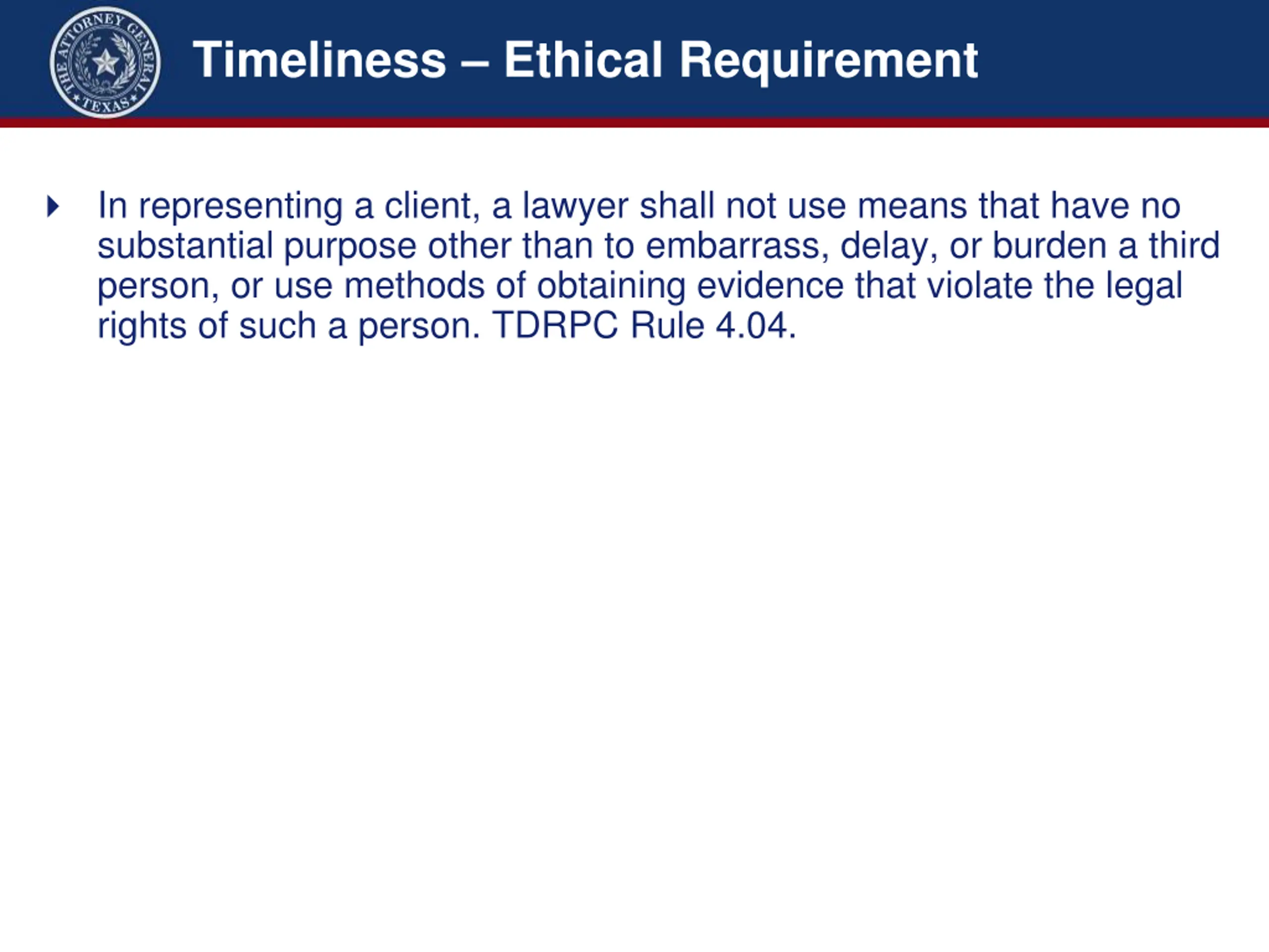 Timeliness Ethical Requirement In representing a client, a lawyer shall not use means that have no substantial purpose other than to embarrass, delay, or burden a third person, or use methods of obtaining evidence that violate the legal rights of such a person. TDRPC Rule 4.04.